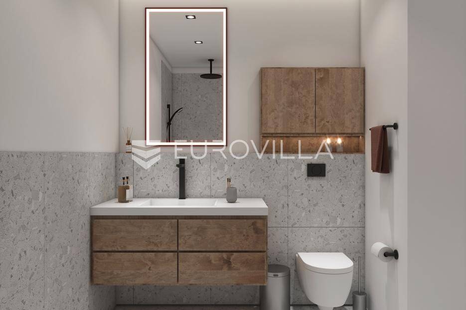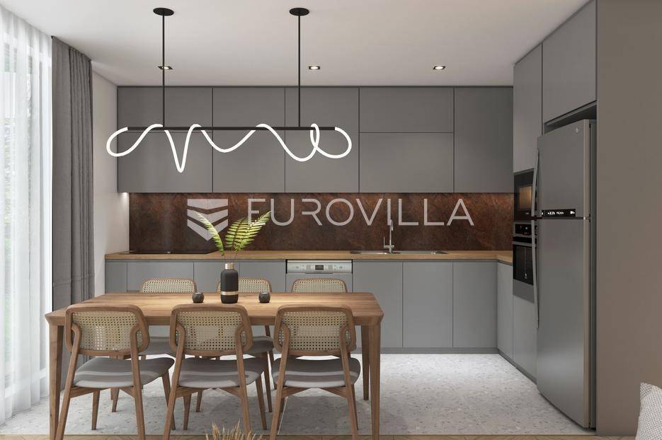 Na samo 200 m od mora smjestio se ovaj jednosobni stan u prizemlju ukupne stambene veličine od 60,49 m2.Stan se sastoji od ulaznog hodnika, kupatila, spavaće sobe, dnevnog boravka, kuhinje s blagovaonicom, natkrivene terase, parking mjesta i vanjskog vrta.Unutarnje uređenje stanova zadovoljavat će više kriterije kvalitete gradnje kao i visoki energetski certifikat. Vanjska stolarija - PVC s troslojnim staklima i aluminijskim roletama na elektromotor, fasada - demit na katu debljine 12 cm, u prizemlju 8 cm plus 2 cm kamen Travertino classico, hlađenje i grijanje - Mitsubishi klime te podno grijanje na struju u svim prostorijama s wi-fi termostatima, završne podne obloge - keramičke pločice Marca Corona.Nekretninu moguće kupiti putem stambenog kredita, vlasništvo uredno 1/1.Odlična prilika za investiciju.Za više informacija Vam stojimo na raspolaganju.... Više na eurovilla.hr, ID: 305787