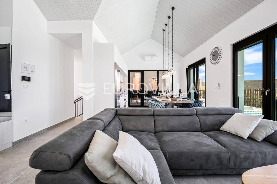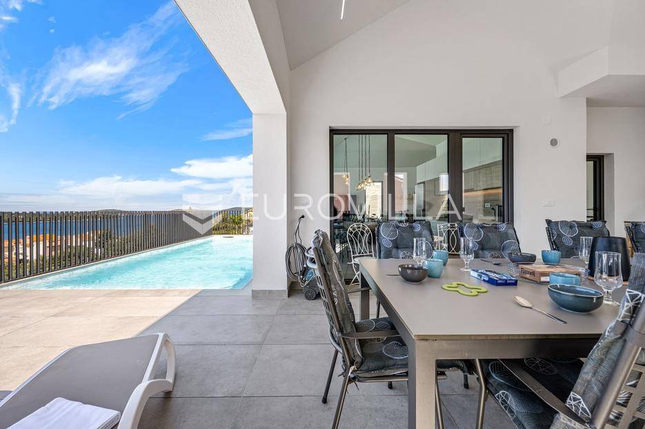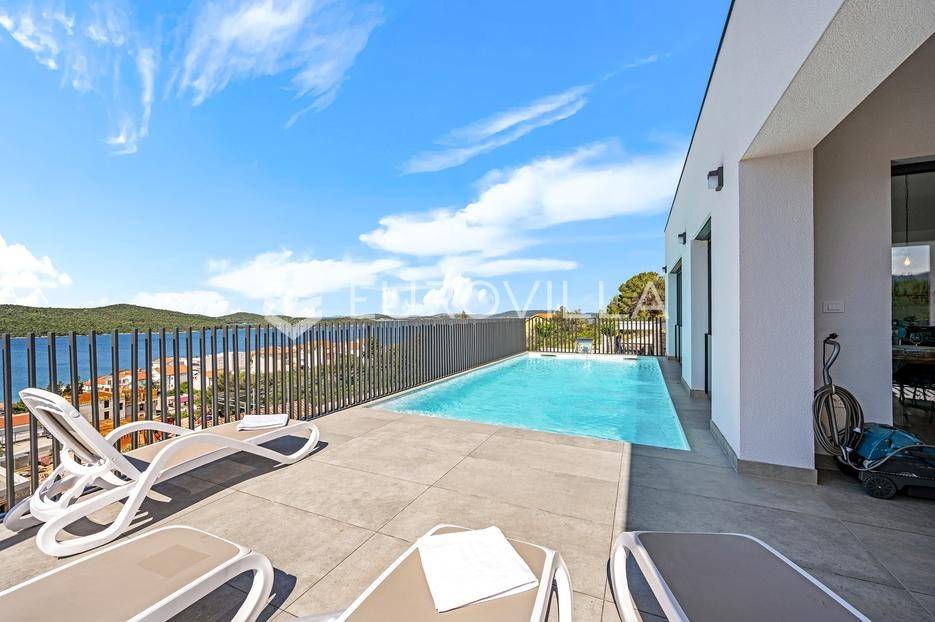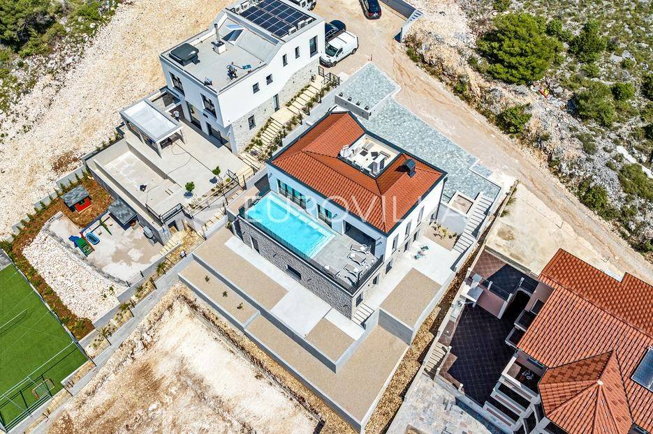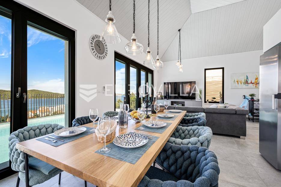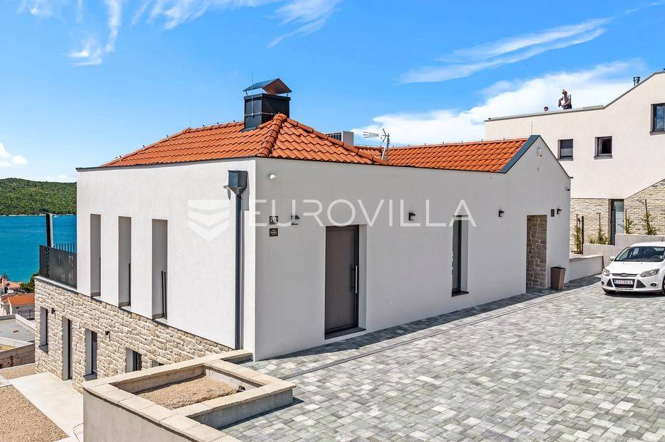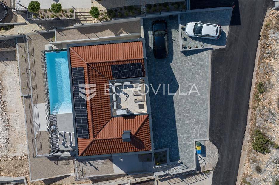 Šibenik, Žaborić, moderna vila, neto korisne površine 208,92 m² izgrađena 2022. Uz villu je grijani bazen na terasi s pogledom na more. Prodaje se potpuno namještena i opremljena idealna za odmor ili nastavak dosadašnjeg uspješnog turističkog najma.Izgrađena na 2 etaže na parceli od 581 m². Sastoji se od prizemlja u kojem su 4 spavaće sobe, svaka sa svojom kupaonicom, boravka s kuhinjom, prostorija predviđenih za wellness i saunu, te kupaonicom. Na prvom katu nalazi se prostrani dnevni boravak s kuhinjom i blagovaonicom, WC, praonica i kotlovnica. Ugrađeno je podno grijanje s dizalicom topline.Pored ville nalazi se grijani bazen, uz koji su dvije terase i pečenjara. Iza ville nalazi se 6 parkirnih mjesta. Villa je opremljena solarnim panelima snage 4,6 kw, te ima punionicu za el. aute.Sve ostale informacije na upit.... Više na eurovilla.hr, ID: 351802