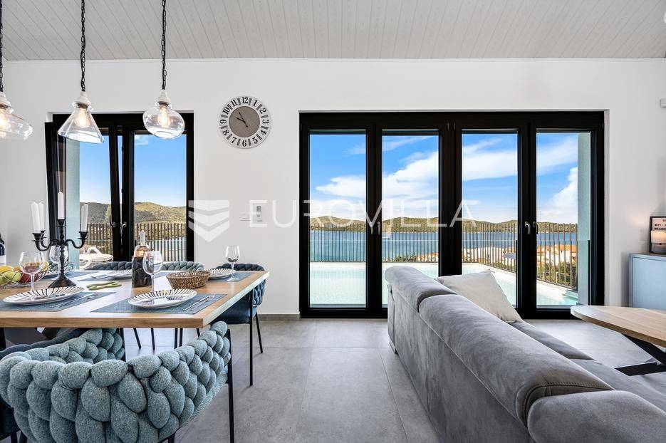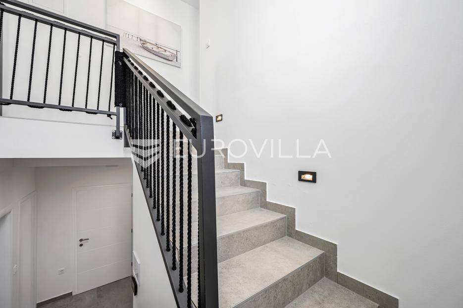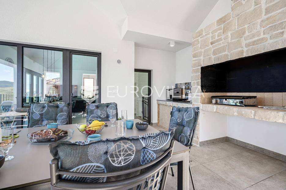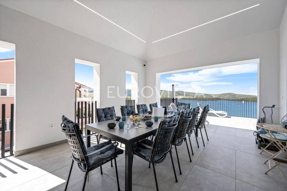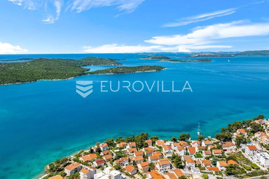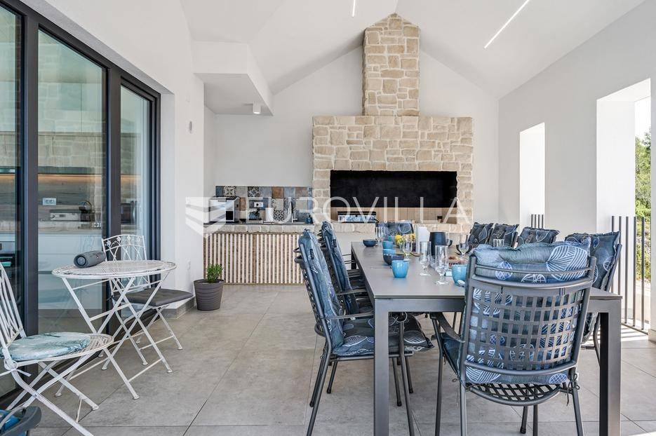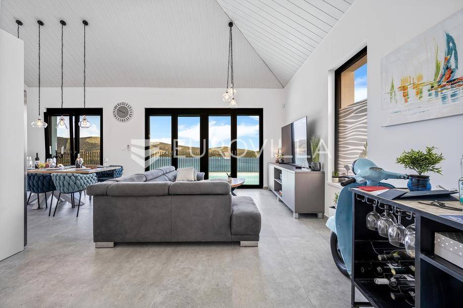 Šibenik, Žaborić, moderna vila, neto korisne površine 208,92 m² izgrađena 2022. Uz villu je grijani bazen na terasi s pogledom na more. Prodaje se potpuno namještena i opremljena idealna za odmor ili nastavak dosadašnjeg uspješnog turističkog najma.Izgrađena na 2 etaže na parceli od 581 m². Sastoji se od prizemlja u kojem su 4 spavaće sobe, svaka sa svojom kupaonicom, boravka s kuhinjom, prostorija predviđenih za wellness i saunu, te kupaonicom. Na prvom katu nalazi se prostrani dnevni boravak s kuhinjom i blagovaonicom, WC, praonica i kotlovnica. Ugrađeno je podno grijanje s dizalicom topline.Pored ville nalazi se grijani bazen, uz koji su dvije terase i pečenjara. Iza ville nalazi se 6 parkirnih mjesta. Villa je opremljena solarnim panelima snage 4,6 kw, te ima punionicu za el. aute.Sve ostale informacije na upit.... Više na eurovilla.hr, ID: 351802