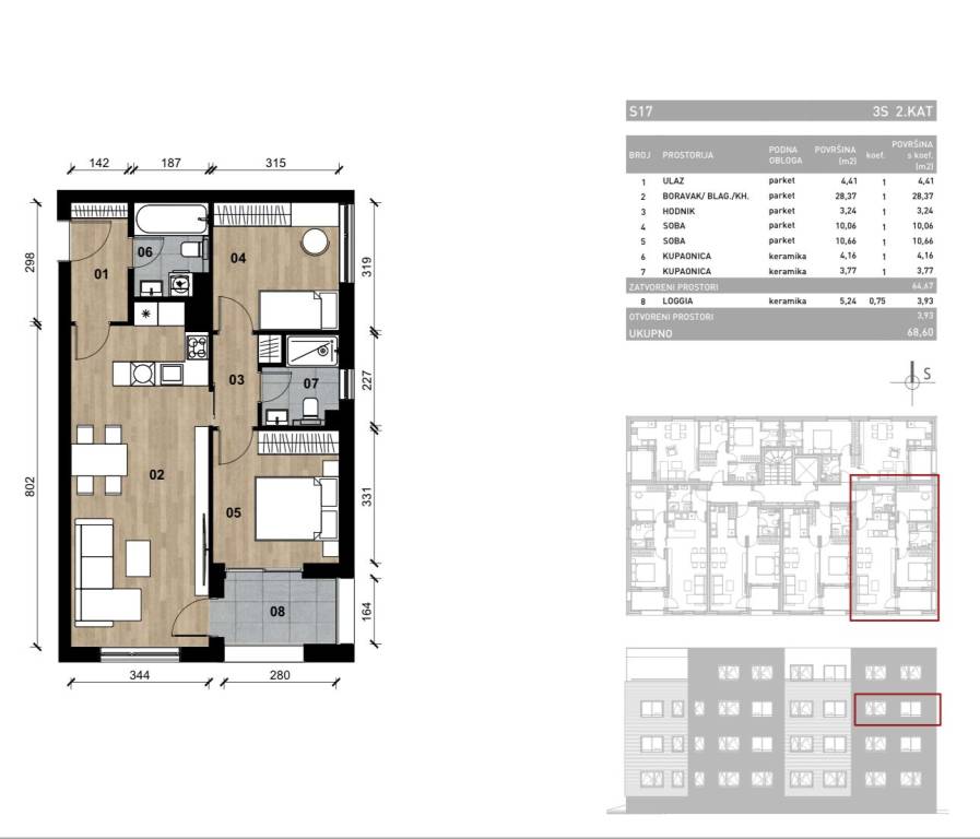 Zagreb, Dugave, novogradnja na tri etaže s liftom, sa logggiama i terasama te spremištima, podzemnom garažom i vanjskim parkirnim mjestima.Stan S-17, trosoban stan na drugom katu, zatvorene površine 64,67 m2.Sastoji se od: ulaznog hodnika, open space dnevnog boravka s blagovaonicom i kuhinjom, hodnika, dvije spavaće sobe, dvije kupaonice i loggie (površine 5,24 m2). Sveukupno 68,60 m2.Objekt je projektiran prema najsuvremenijim standardima gradnje; dok je čitava konstrukcija armirano - betonska. Ravni krov je neprohodni, izoliran hidroizolacijskim folijama nove generacije, te toplinskom izolacijom debljine 20 cm. Fasada je također izvedena u ETICS sustavu s toplinskom stiropor izolacijom debljine 15 cm, što u konačnici svrstava zgradu u A energetski razred.Pomno je biran svaki detalj, pa je tako vanjska stolarija u izvedbi aluminij - drvo s troslojnim staklom, sva rasvjeta u LED izvedbi, keramičke pločice su prve klase u sanitarnim čvorovima i terasama, a sva sanitarna oprema je visoke kvalitete poznatih svjetskih proizvođača.Dnevni boravci opremljeni su zidnim klima uređajima, dok je grijanje i topla voda preko kondenzacijskih bojlera.Zgrada je opremljena dizalom, zelene su površine hortikulturno uređene s odvojenim prostorom za smještaj kanti za otpad.Odlična lokacija. Blizina parka, ljekarne, trgovina, crkve, frizerskog salona i sadržaja.Za sva dodatna pitanja stojimo na raspolaganju.... Više na eurovilla.hr, ID: 387274