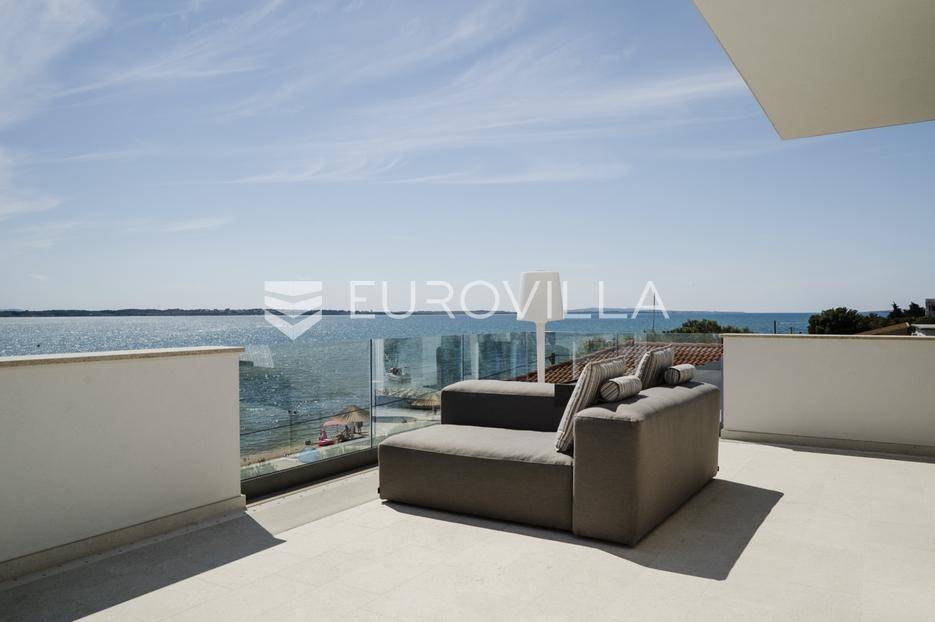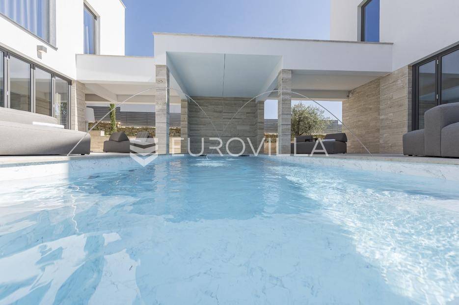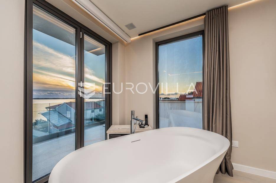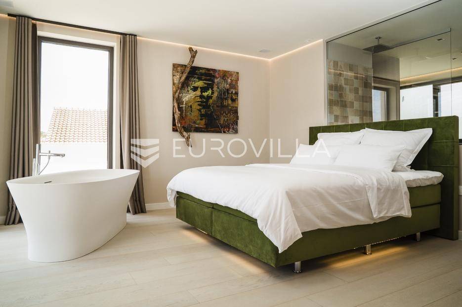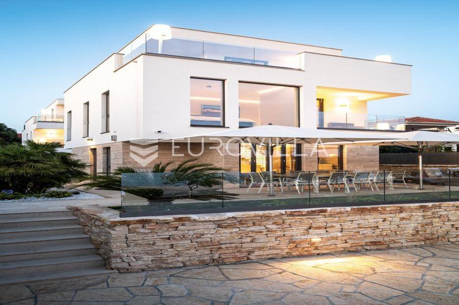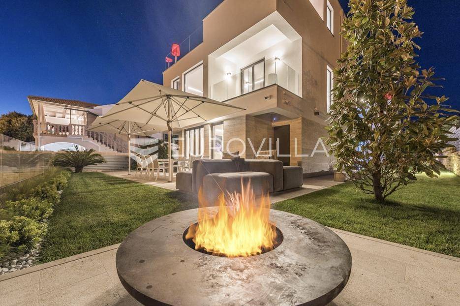 Ekskluzivan kompleks od dvije moderno dizajnirane i potpuno opremljene vile, dovršen 2020. godine.Vile su pozicionirane na prvoj liniji uz plažu, s neposrednim dodirom s morem, što im daje iznimnu vrijednost i atraktivnost. Riječ je o premium nekretnini idealnoj za obitelji ili prijatelje koji žele boraviti zajedno, uz potpunu privatnost i vrhunski komfor.Obje vile imaju otvorene poglede na more i uvalu, a velike staklene stijene osiguravaju obilje prirodnog svjetla i povezanost s mediteranskim okruženjem.Svaka etaža u oba objekta ima vlastiti balkon ili terasu opremljenu visokokvalitetnim lounge namještajem. Prednja vila posebno se ističe panoramskim pogledima na cijelu uvalu Vrsi iz svih katova i prostire se na tri etaže, ukupne stambene površine 172 m².U prizemlju se nalazi prostrani dnevni boravak s blagovaonicom i otvorenom kuhinjom koji se otvaraju prema dvjema terasama i bazenu.Na prvom katu smještene su dvije dizajnerski uređene spavaće sobe, svaka s vlastitom kupaonicom.Drugi kat zauzima djelomično natkrivena krovna terasa s izuzetnim pogledom na more i šetnicu, idealna za opuštanje i privatnost.Kompleks uključuje brojne dodatne sadržaje koji osiguravaju luksuzan boravak tijekom cijele godine, među kojima su sauna, jacuzzi na krovnoj terasi, dvije potpuno opremljene kuhinje, kućno kino, zvučni sustav, sustav nadzora, automatsko navodnjavanje, zajednički bazen i vanjski tuševi. Prostrana okućnica uređena je mediteranskim biljem, a osigurana su četiri parkirna mjesta.Parcela ukupne površine 806 m² pruža dovoljno privatnosti, dok ukupna stambena površina kompleksa iznosi 370,65 m². Kombinacija izvanredne lokacije na plaži, modernog dizajna i vrhunskih sadržaja čini ovu nekretninu idealnom za privatno korištenje ili luksuzni najam.Ova nekretnina je savršena za privatno korištenje, pružajući Vam ekskluzivan dom iz snova, ili kao izvrsna investicija za luksuzni najam.Za dodatne informacije i dogovor oko razgledavanja, stojimo na raspolaganju.... Više na eurovilla.hr, ID: 454649