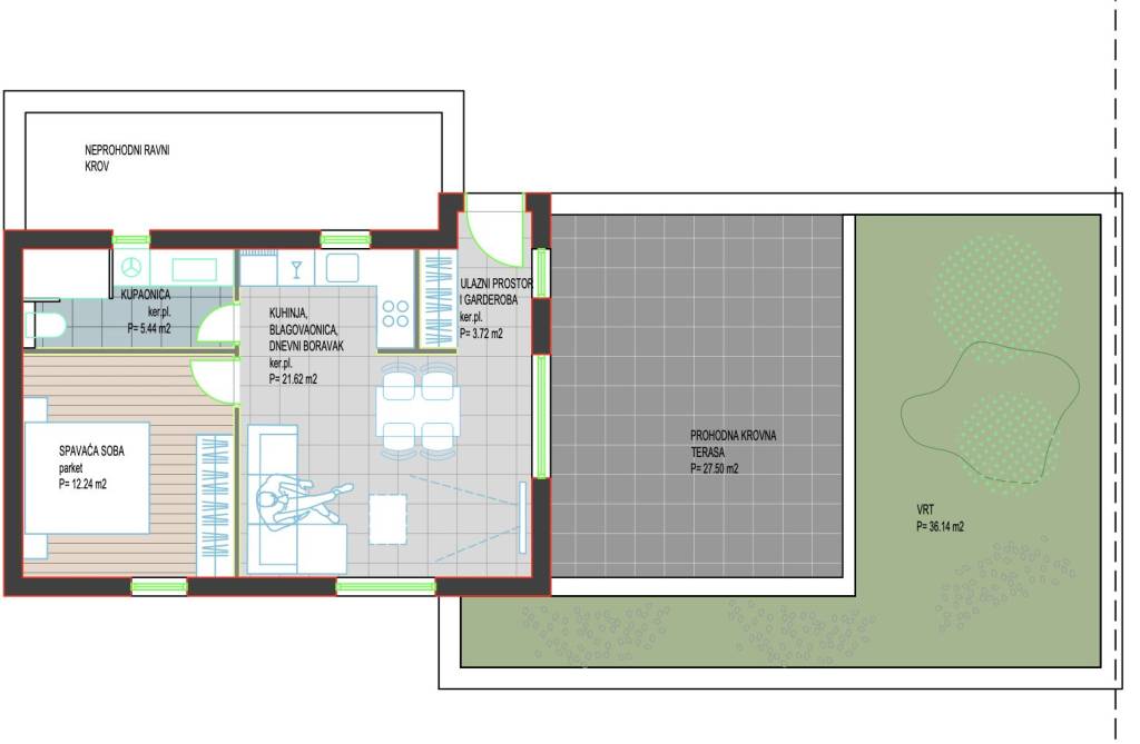 Trogir, na pješačkoj udaljenosti od strogog centra grada , predviđena je izgradnja dvojnog objekta moderne vizure, s funkcionalnim rasporedom stambenih jedinica.Stan D6 - smješten je na etaži nadgrađa, u naravni je jednosoban , a sastoji se od ulaznog hodnika, kupaonice, spavaće sobe i dnevnog prostora ( kuhinja s blagovaonicom i dnevni boravak ). Pripada mu prostrana krovna terasa površine 27, 50 m2, zelena površina/ vrt na krovnoj terasi površine 36, 14 m2 , te jedno vanjsko parkirno mjesto. Površina zatvorenog stambenog dijela iznosi 42, 66 m2, dok je ukupna 54, 26 m2.Početak gradnje je predviđen na jesen 2025. godine.Za sva dodatna pitanja, stojimo vam na raspolaganju.... Više na eurovilla.hr, ID: 599535