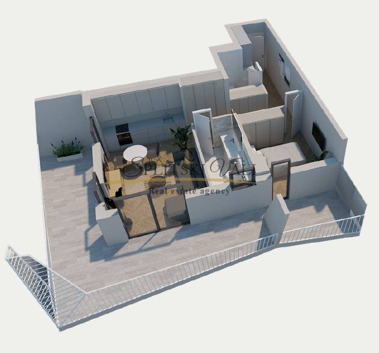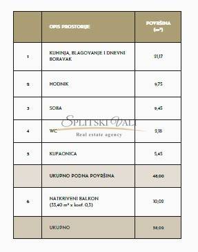 Sastoji se od dnevne sobe, kuhinje s blagovaonicom, spavaće sobe, kupaonice , WC-a te natkrivenog balkona veličine čak 33.40m2.