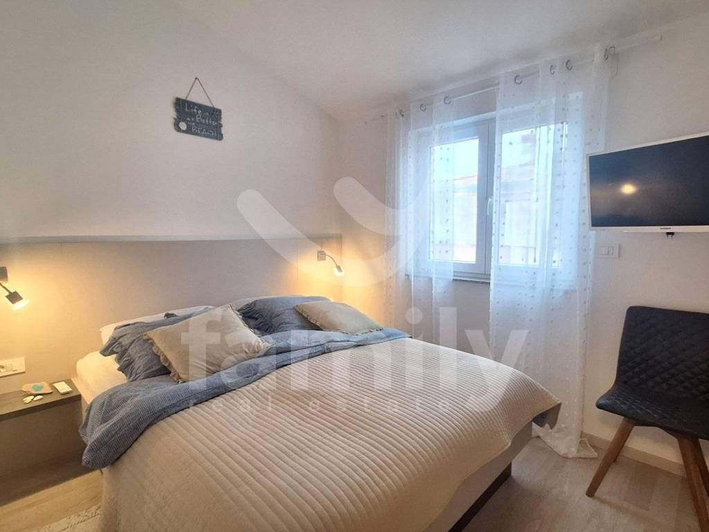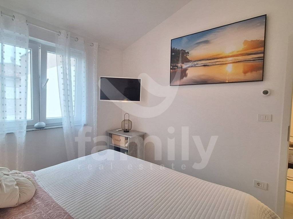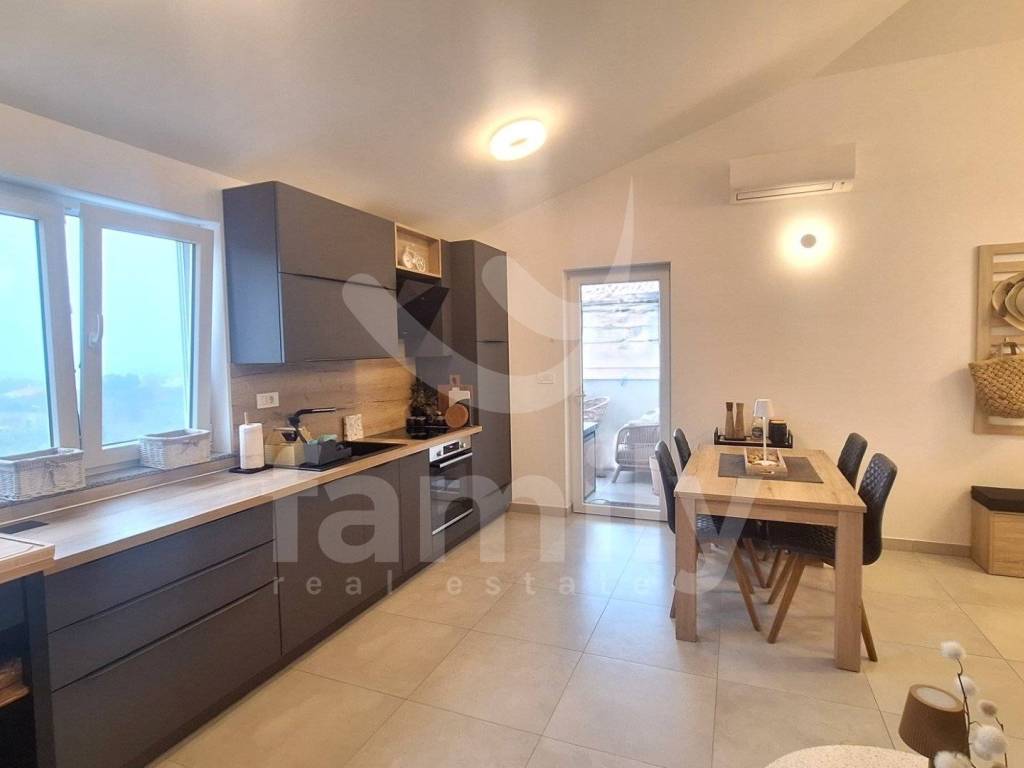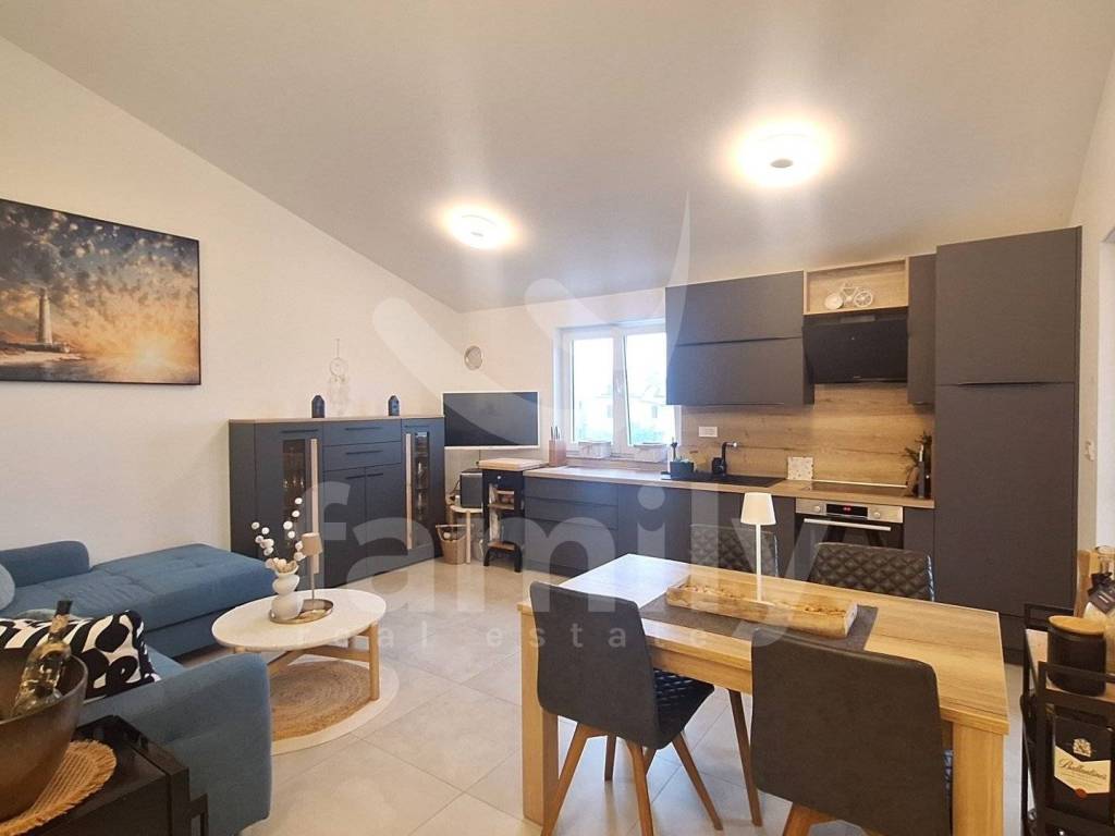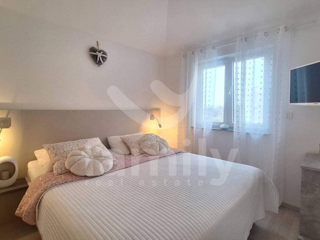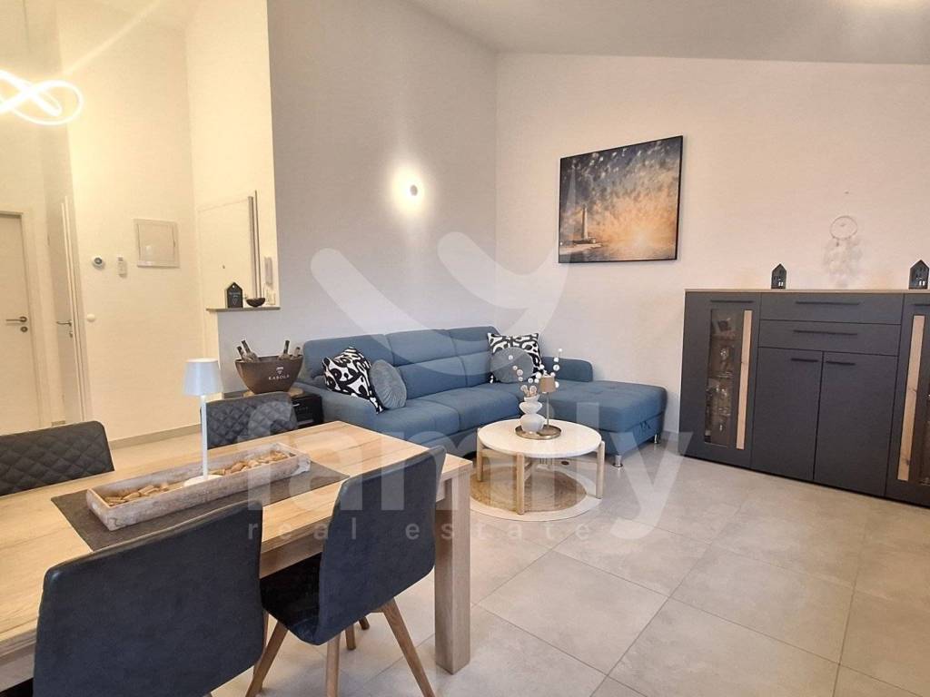 In a quiet part of Peroj, this quality and modernly equipped apartment of 60 m2 is located, located on the second floor of a building with a total of 9 residential units. The apartment consists of an entrance hall, an airy and bright living room connected to a fully equipped custom-made kitchen and a dining room with access to a balcony with a beautiful view of the sea. The apartment also consists of two comfortable bedrooms equipped with custom-made wardrobes, a utility room, a modern bathroom with a walk-in shower, a water heater, a built-in GEBERIT cistern and a washing machine. The property is equipped with a burglar-proof entrance door and intercom. Heating and cooling is regulated by the air conditioning unit, while additional comfort is provided by infrared panels. The entire property is equipped with PVC carpentry with double-glazed windows with seven gas chambers, blinds as well as mosquito nets on electric lifts and a thermal facade of 10 cm thickness, which ensures excellent heat and sound insulation. The floors are covered with high-quality laminate and ceramics. The apartment is sold fully furnished, including all appliances and one parking space.