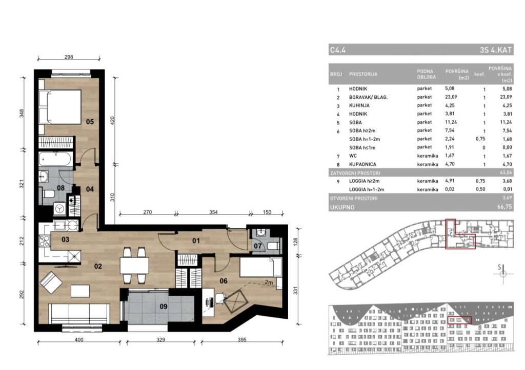 Zagreb, Dubrava, dvosoban stan, u novogradnji u izgradnji,Objekt je projektiran prema najsuvremenijim standardima gradnje; dok je čitava konstrukcija armirano - betonska.Stan oznake C4.4 na četvrtom katu, površine 66,75 m2.Sastoji se od: ulaznog hodnika, dnevnog boravka i blagovaonice s izlazom na loggiu ( površine 4,91 m2), kuhinje, spavaće sobe i toaleta, drugog hodnika hodnika te spavaće sobe i kupaonice .Spavaća soba i dnevni boravak opremljeni su klima uređajima uz mogućnost upravljanja putem aplikacije.Grijanje i priprema tople vode preko plinskih kondenzacijskih bojlera. Ugrađen je sustav za daljinsko očitanje i digitalni termostat uz mogućnost spajanja na Wi-fi te upravljanje putem aplikacije. U svim prostorijama su moderni pločasti radijatoriOprema stana sadrži : protupožarna i protuprovalna ulazna vrata s zvučnom izolacijom, troslojna stakla, aluminijske rolete, hrastov parket te keramičke pločice prve klase.Vrhunska izgradnja s visoko kvalitetnim materijalima renomiranih proizvođača.Uz stan je obvezna kupnja vanjskog parkirnog mjesta ili garažnog parkirnog mjesta. Spremište opcionalno.Odlična lokacija. Blizina dječjeg vrtića, osnovne škole, bolnice, doma zdravlja, shopping centra, crkve, ljekarne i dermatološke klinike, blizina i parka Maksimir teZET okretište Dubrava, dok je autobusna stanica u neposrednoj blizini zgrade.Planirano useljenje: jesen 2026 godine.Ostale informacije na upit.... Više na eurovilla.hr, ID: 855513
