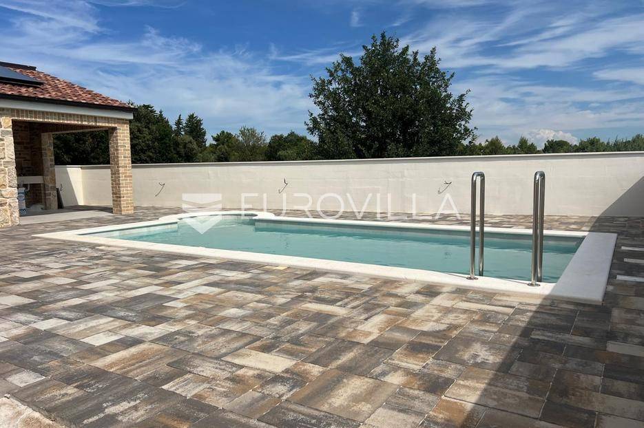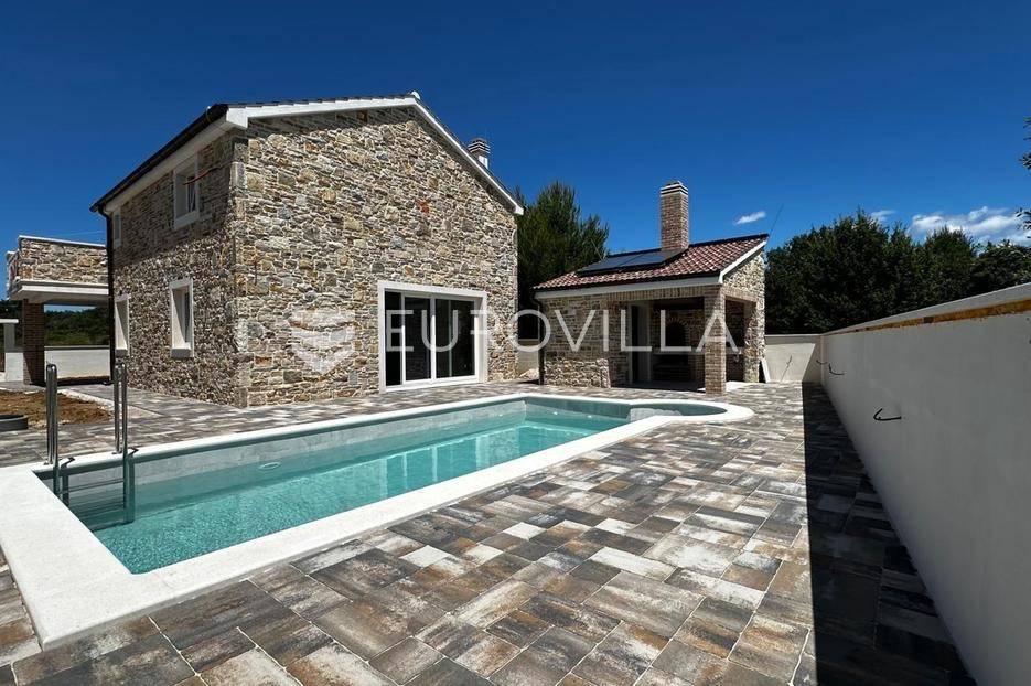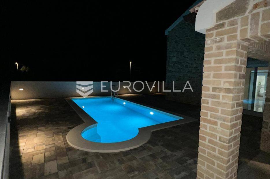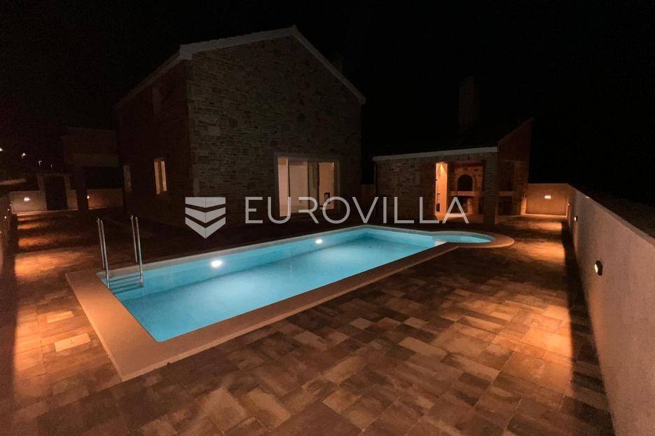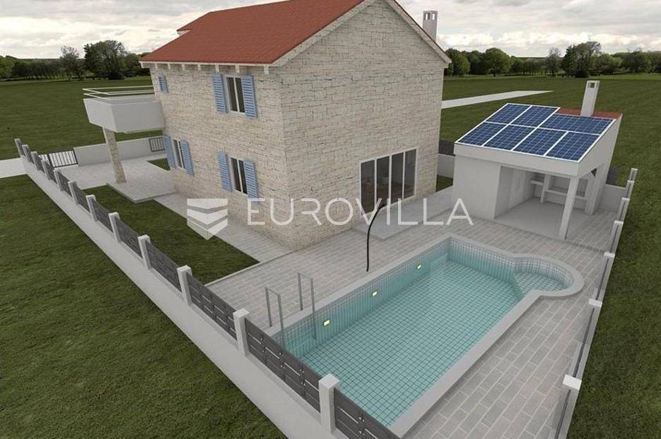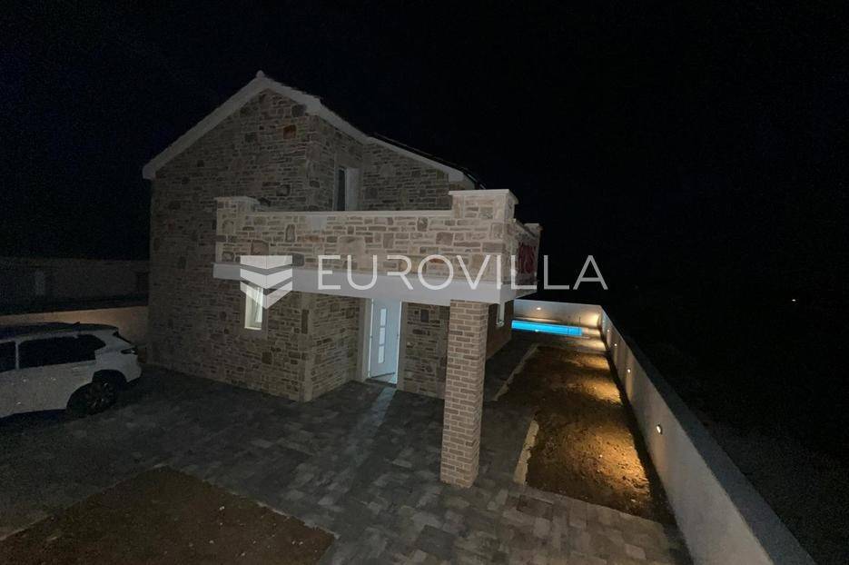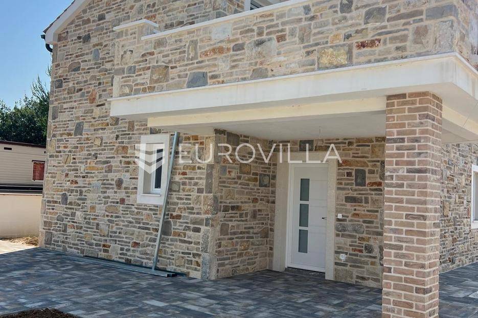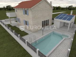 Zadar, Vrsi, novoizgrađena prekrasna kamena kuća na izuzetno mirnoj lokaciji.Kuća površine 165m2, smještena je na zemljištu površine 394 m2, ima dvije etaže, vanjski bazen i okućnicu.U prizemlju, gdje s natkrivenog trijema ulazimo u kuću, nalazimo spavaću sobu i kupaonicu, kuhinju, blagovaonu i dnevni boravak otvorenog tlocrta iz kojeg izlazimo u veliko dvorište s bazenom.Na katu se nalaze dvije spavaće sobe sa zajedničkom kupaonicom, te prostrana soba (master bedroom) s en suite kupaonicom i izlazom na veliku terasu.U dvorištu se nalazi bazen površine 25,8m2, 8 m x 4 m, te pomoćni objekt u kojem je ljetna kuhinja s roštiljem, te bazenska tehnika. Na krovu su postavljeni solarni paneli kojima se grije bazen i kuća.Grijanje kuće se provodi putem dizalice topline. U dnevnom boravku je ugrađen i komin obložen kamenom, koji zimi daje toplinu i predivan ugođaj, a hlađenje se odvija klima uređajima koji se nalaze u svakoj prostoriji.Kuća je građena od visokokvalitetnih materijala, te se pazilo na sve detalje kako bi boravak u njoj bio maksimalno ugodan.Video nadzor je za dodatnu sigurnost, kuća je toplinski izolirana s Eps-om i kamenom oblogom od 3 cm. Stolarija na kući je pvc u predivnoj plavoj boji.Pokraj kuće nalaze se tri parkirna mjesta sa stanicom za punjenje električnih automobila.Iako je kuća smještena na mirnoj lokaciji, u blizini se nalaze svi sadržaji potrebni za ugodan život poput dućana, ljekarne, tržnice, kafića, restorana...Za sve dodatne informacije stojimo na raspolaganju.... Više na eurovilla.hr, ID: 939855