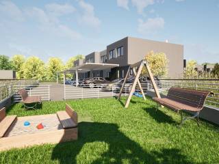 Il piano dingresso è organizzato come un open space che unisce cucina, sala da pranzo e soggiorno in ununità spaziosa e luminosa con accesso diretto a una terrazza di circa 7 m e a un giardino privato. Sullo stesso livello si trovano un bagno per gli ospiti e un locale tecnico.