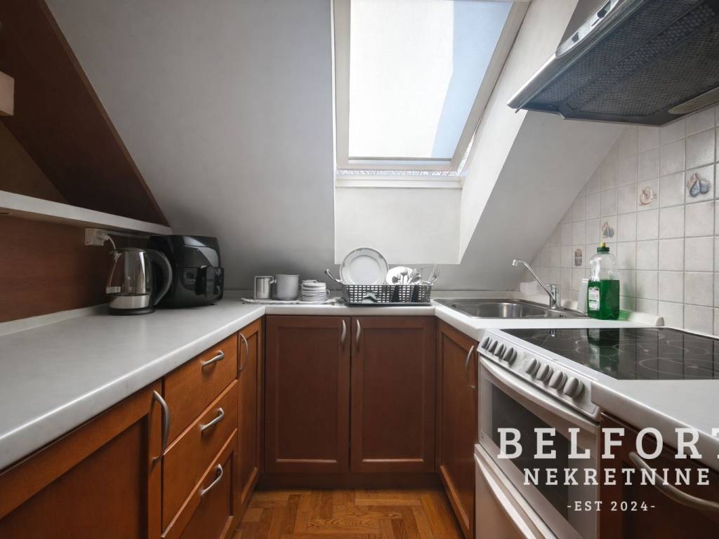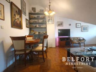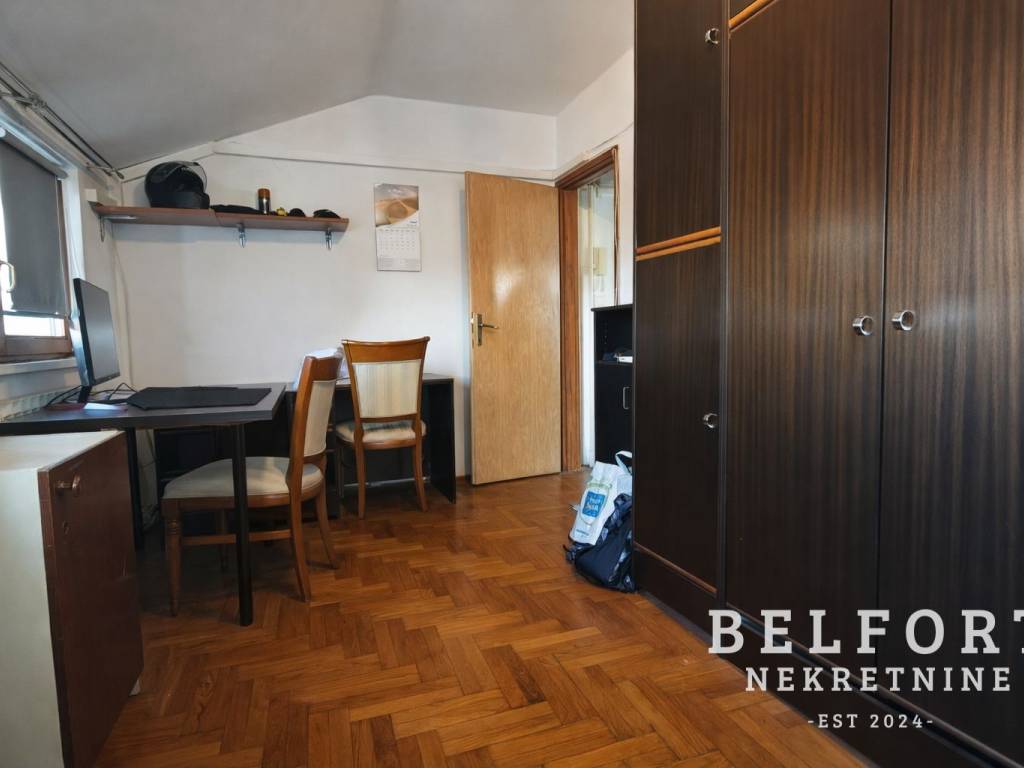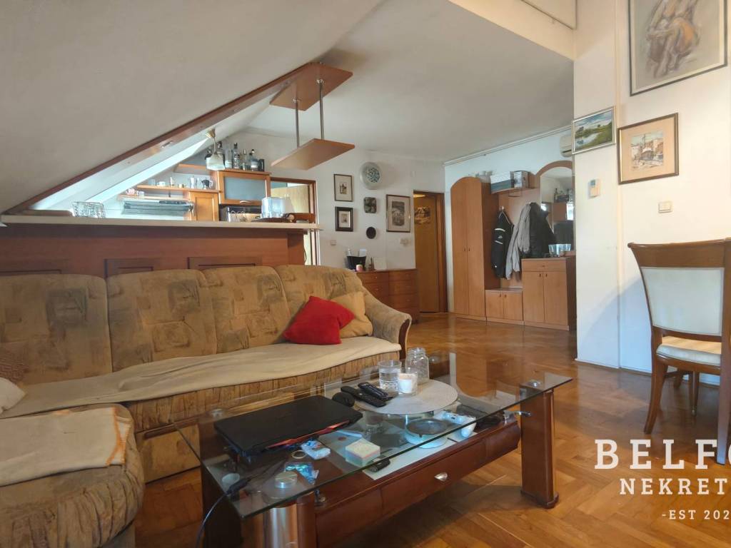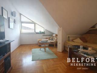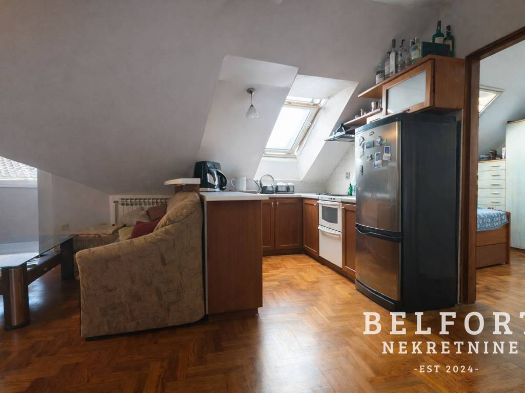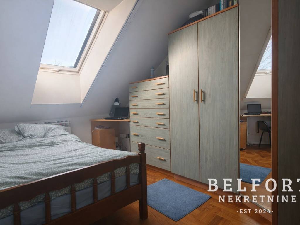 Stan se nalazi u potkrovlju u zgradi od ukupno 4 kata bez lifta izgrađenoj 2000. godine, a sastoji se od, ulaznog hodnika, dnevnog boravka s blagovaonicom, kuhinje, dvije spavaće sobe i kupaonice s WC-om.