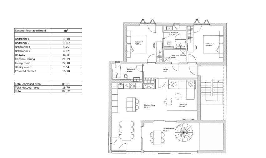 Within the property, one covered parking space and a roof terrace with an area of 64.24 m2 are provided.