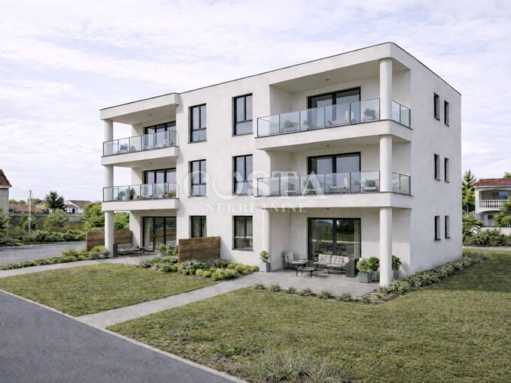 An apartment under construction is for sale in Privlaka, Zadar County. The apartment with a living area of ​​57 m2 is located on the first floor of a smaller residential building with six units. It consists of a living room, kitchen and dining room, two bedrooms and a bathroom, and a covered terrace of an additional 10 m2. The apartment also includes two parking spaces in the building's courtyard. The total selling area of ​​the apartment, including the annexes, is 67 m2.