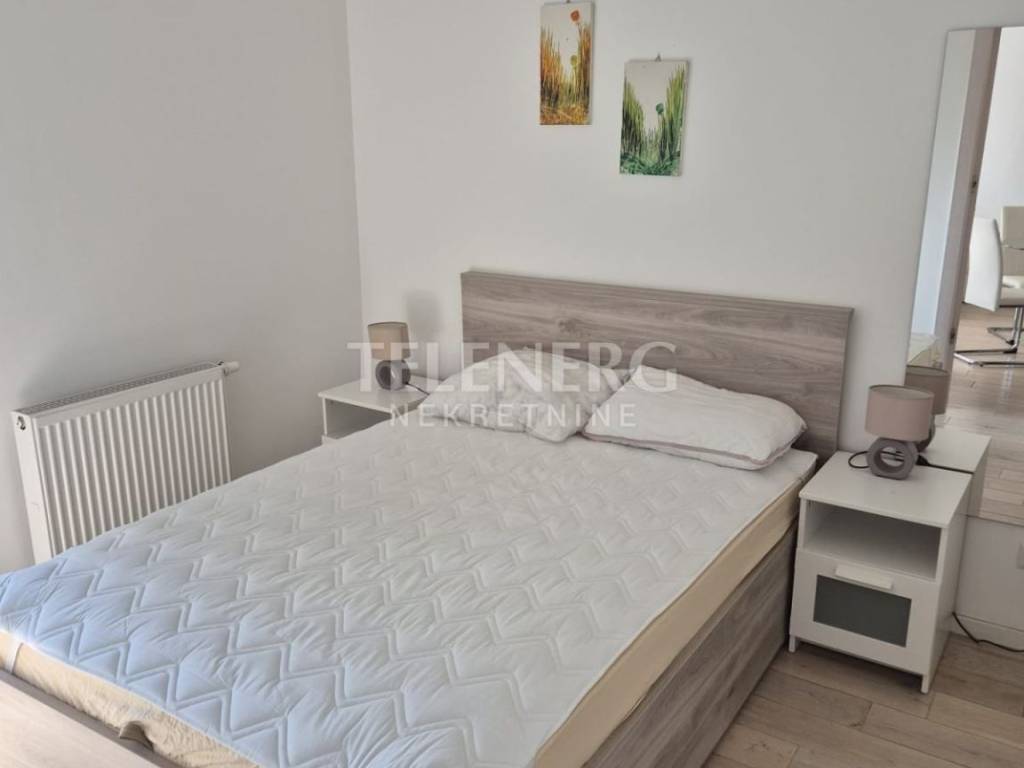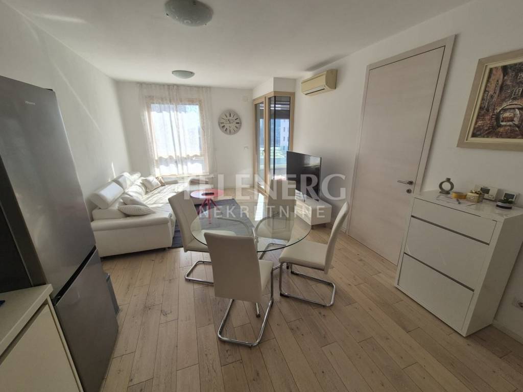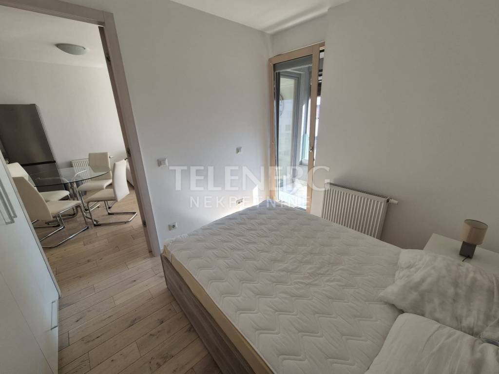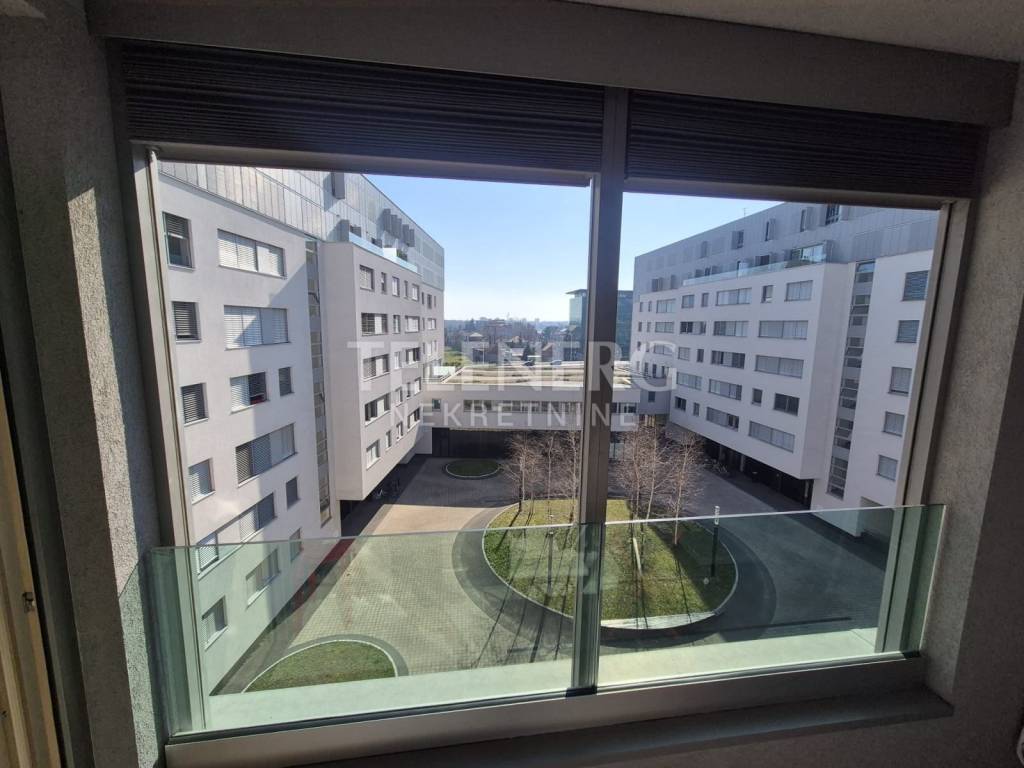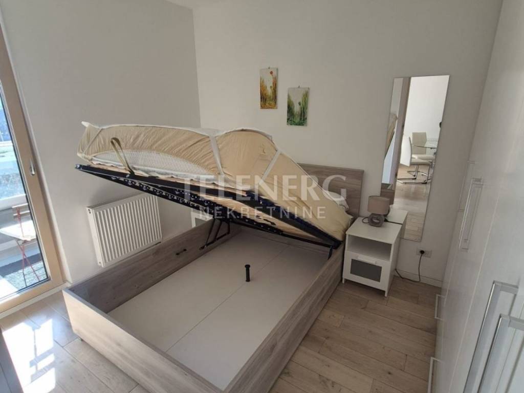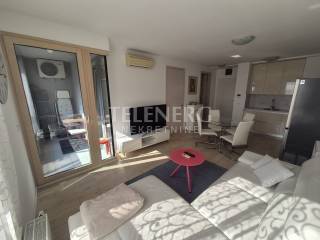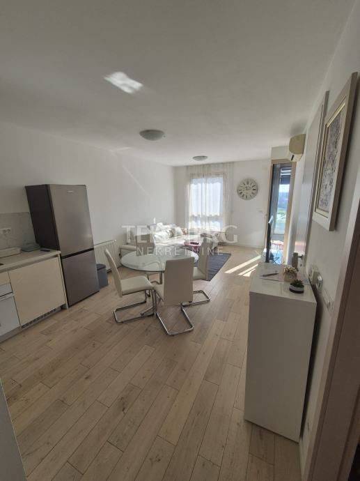 The apartment is located on the fourth floor of a residential-business complex (built in 2013) and consists of an entrance area, large living room and dining room, fully modern equipped kitchen, fully furnished bedroom (140 x 200 bed, large built-in wardrobe), modern bathroom with glass shower cabin and washing machine, closed loggia.