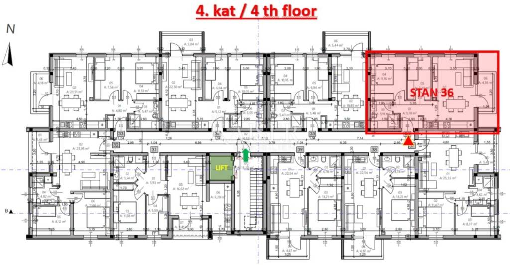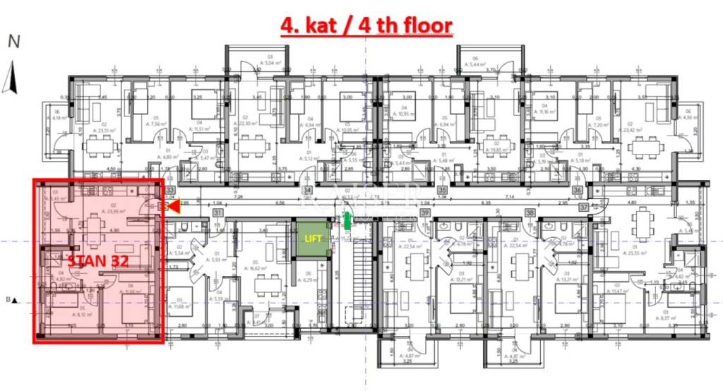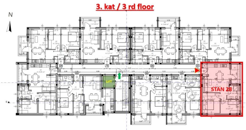 Al terzo e quarto piano di questo moderno edificio si trovano sette appartamenti bilocali di dimensioni simili, rispettivamente di 54,57 m², 54,24 m², 54,20 m², 54,96 m², 54,65 m², 54,33 m² e 54,28 m². Gli appartamenti sono progettati in modo funzionale per sfruttare al meglio lo spazio disponibile e garantire un ambiente piacevole per la vita quotidiana. La maggior parte degli appartamenti è accolta all'ingresso da un corridoio che offre spazio per un guardaroba e conduce alla zona giorno principale, mentre due appartamenti hanno un ingresso diretto a una zona giorno open space. La parte centrale di ogni appartamento è un open space che unisce cucina, sala da pranzo e soggiorno, creando uno spazio ampio e luminoso, ideale per vivere e socializzare. Dalla zona giorno, gli appartamenti hanno accesso a un balcone o loggia privati di circa 4-5 m², che offrono ulteriore spazio per rilassarsi all'aperto.