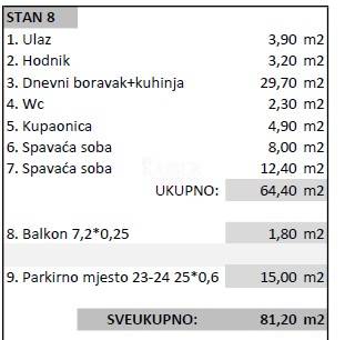 Questo appartamento si trova al primo piano dell'edificio e ha una superficie di 81,20 m². È composto da un ingresso, un ampio soggiorno con accesso alla terrazza, una sala da pranzo e una cucina open space, un bagno, un bagno per gli ospiti e due camere da letto.