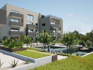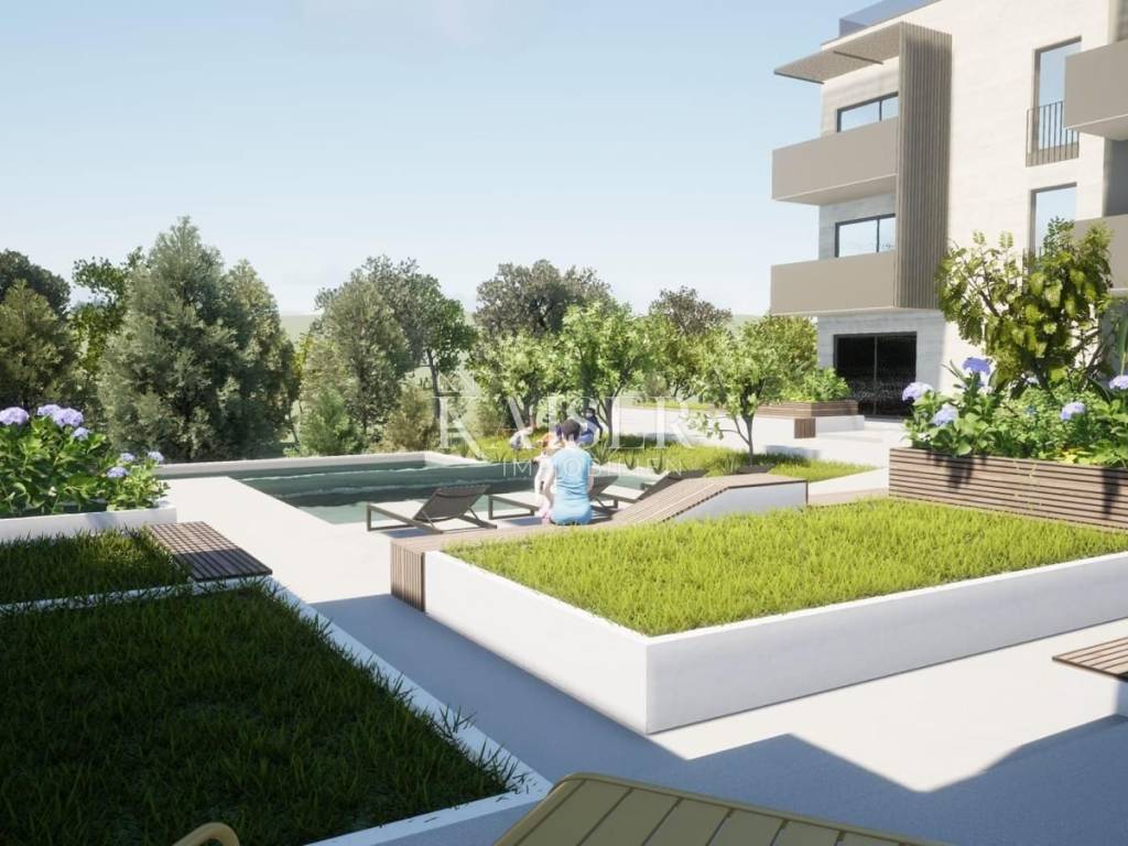 Nel giardino condominiale, i futuri residenti avranno a disposizione due piscine: una più grande per adulti di 70 m² e una per bambini di 30 m², oltre a un'area solarium pavimentata e un'ampia area verde decorata con piante mediterranee e orticoltura.