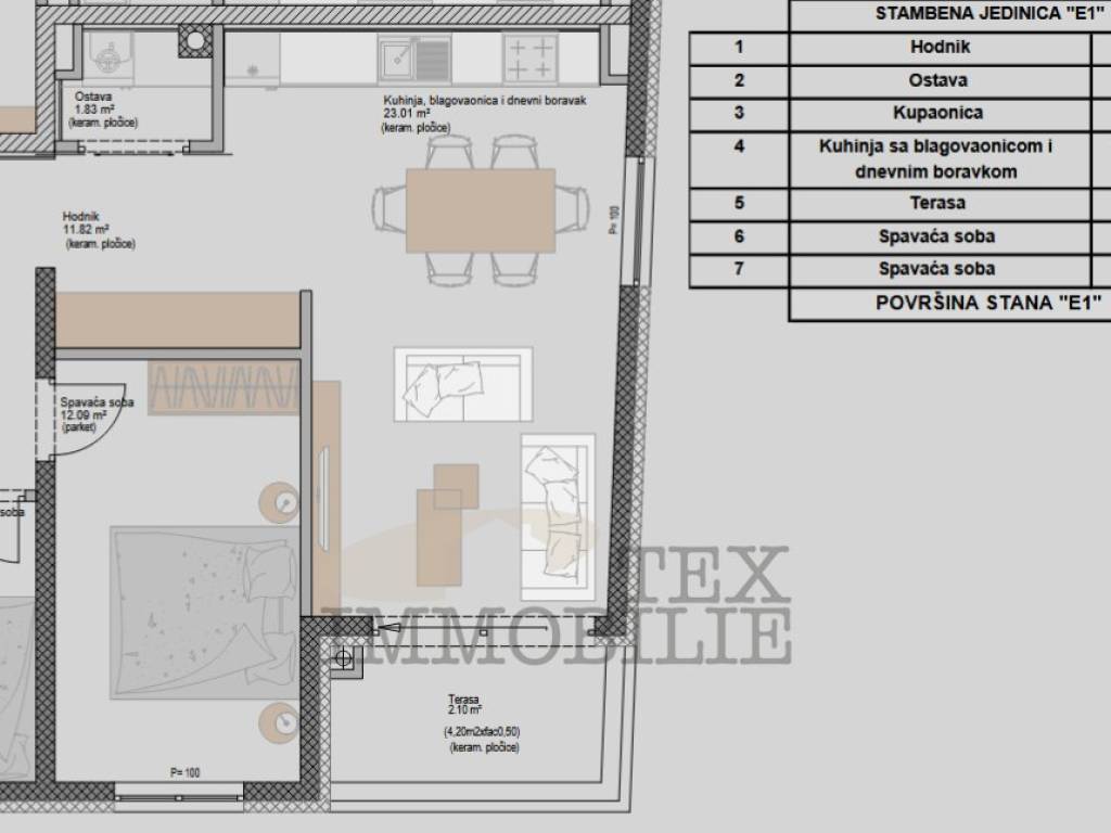 L’appartamento è composto da soggiorno con cucina e zona pranzo di 23,01 m², due camere da letto, un ripostiglio, un bagno e una terrazza.