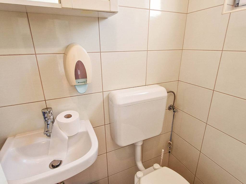 The commercial space, currently used as a physiotherapy clinic, is partially separated by a wall for privacy and includes a reception area and a bathroom.