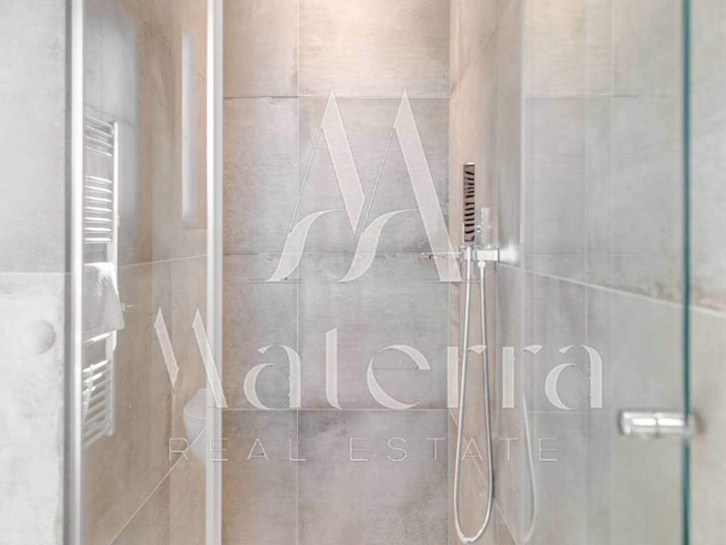 The interior is arranged over two floors. The ground floor features a spacious living area with an open-concept kitchen and dining room, a guest toilet, and a laundry room. The upper floor includes four bedrooms, each with its own bathroom and air conditioning, as well as a terrace with a sea view.