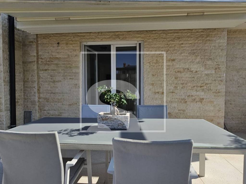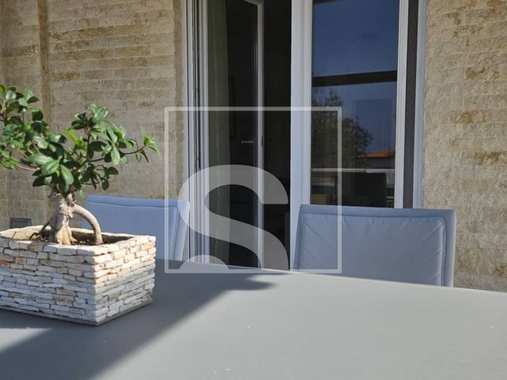 The spacious terrace is paved with natural stone and covered with an electric awning that can be used as needed, providing pleasant shade and extra sun protection.