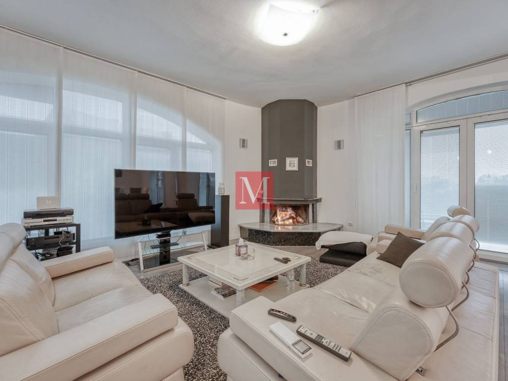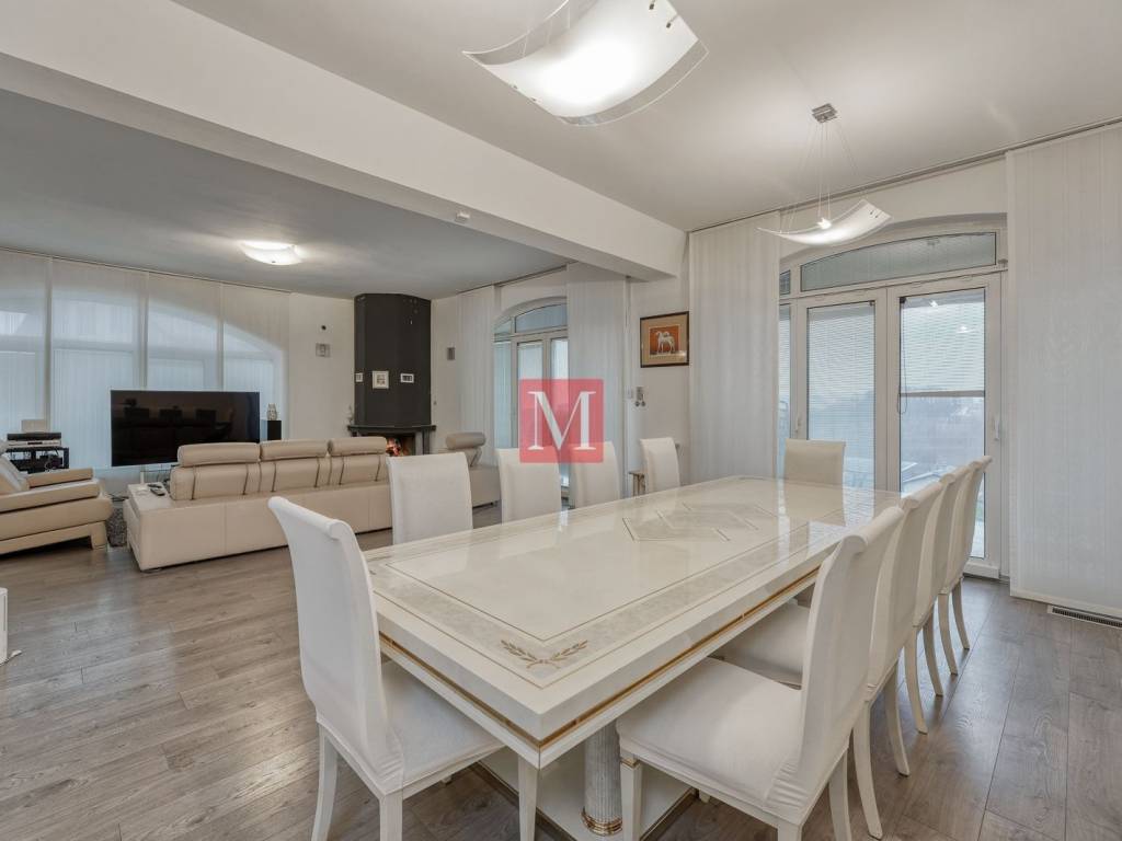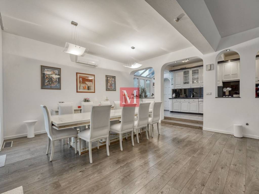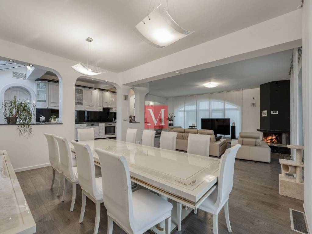 ground floor: representative entrance hall with staircase, open space living room with open fireplace and exit to the terrace, dining room and a kitchen, storage room, utility area for washing and drying of clothes, guest toilet, double garage with dry entrance to the house