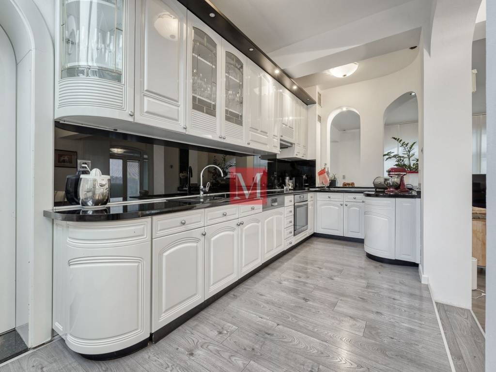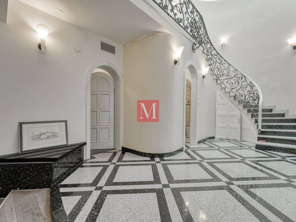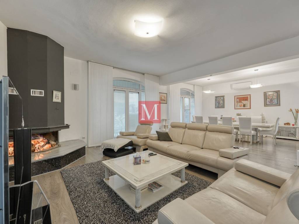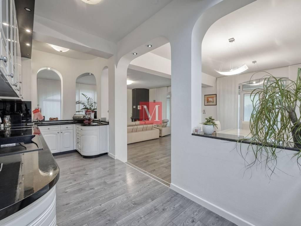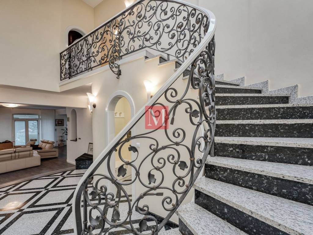 ground floor: representative entrance hall with staircase, open space living room with open fireplace and exit to the terrace, dining room and a kitchen, storage room, utility area for washing and drying of clothes, guest toilet, double garage with dry entrance to the house