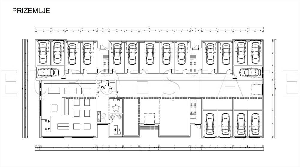 - u etaži prizemlja mogu se izgraditi jedan poslovni prostor sa skladištem i 19 garaža,