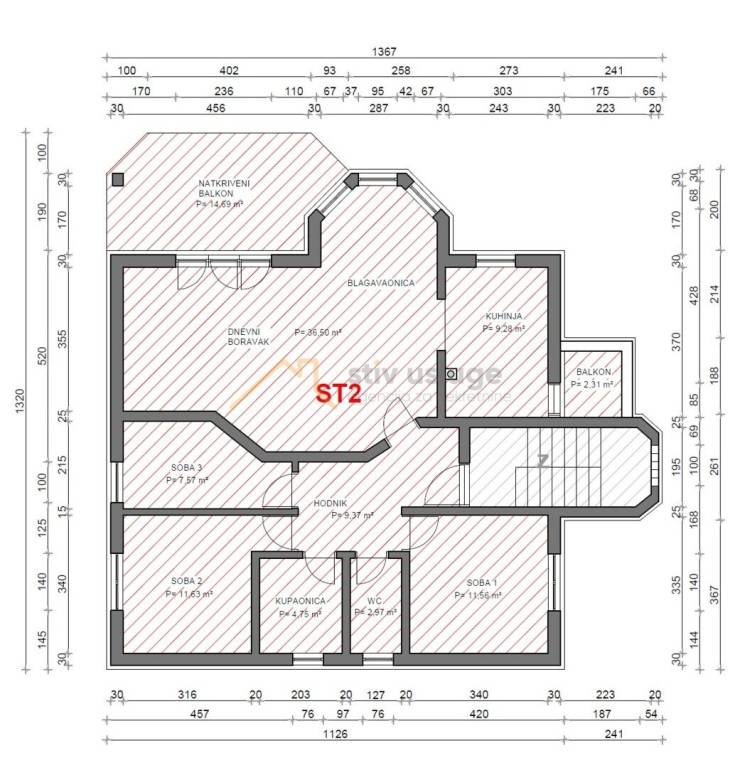 Stan se sastoji od sastoji od hodnika, kupaonice, kuhinje, dnevnog boravka i blagovaonice, 3 spavaće sobe i natkrivenog balkona korisne (podne) površine 14,65 m2.