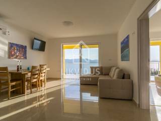Tri apartmana imaju kuhinju s blagovaonom, po jednu spavaću sobu, jednu kupaonicu, te veliki balkon s pogledom na more. Tri apartmana imaju kuhinju s blagovaonom, dvije spavaće sobe, dvije kupaonice, te veliki balkon s pogledom na more.