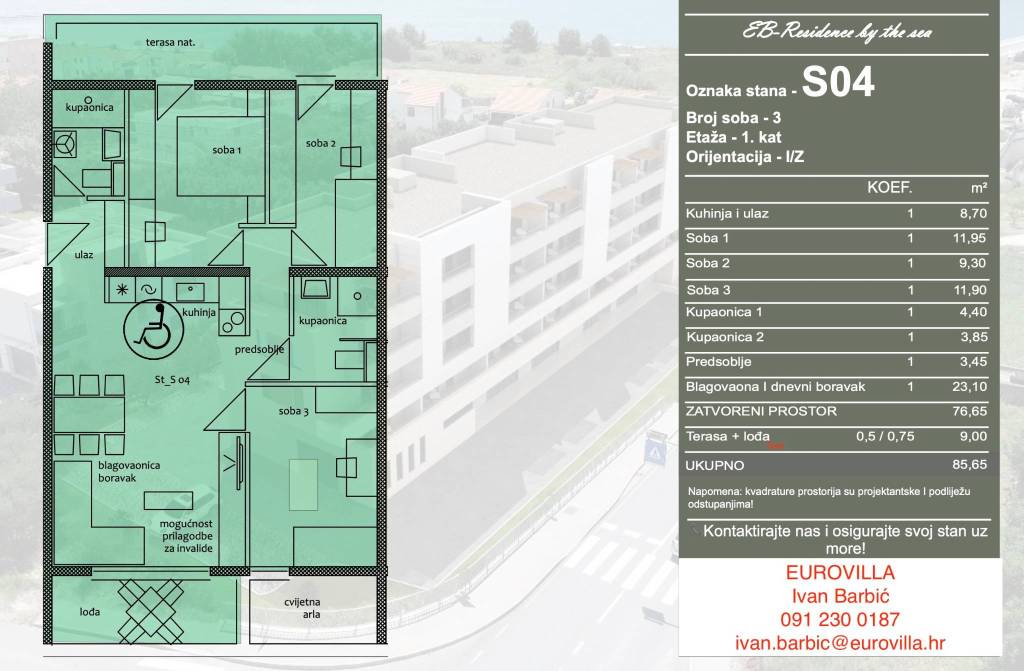 Trogir, novogradnja trosoban stan od 91,5 m2 prvom katu s pogledom na more, gražno mjesto liftom povezano s stanom.Trosoban komforan stan u novogradnji na prvom katu ukupne korisne površine 91,5 m2, koji se sastoji se od: dnevnog boravka, kuhinje s blagovaonicom, tri spavaće sobe, dvije kupaonice, predsoblja te natkrivenog balkon na istoku i lođe na zapadu.Ukupna površina stana iznosi 91,5 m2, od čega je zatvorena stambena korisna površina stana 76,65 m2 uz balkon 9,2 m2 na istoku i lođu 5,8 m2 na zapadu. Neto korisna površina 85,6 m2Uz kupnju stana je obvezna kupnja jednog garažnog parkirnog mjesta u podzemnoj garaži po cijeni 20.000 EUR, uz lift iz garaže do stana.Orijentacija stana je istok- zapad uz dosta svjetla i obolje sunca što će dodatno učiniti dati na komforu i življenja u nekretnini.Za više informacija stojim Vam na raspolaganju na navedenim kontaktima... Više na eurovilla.hr, ID: 304568