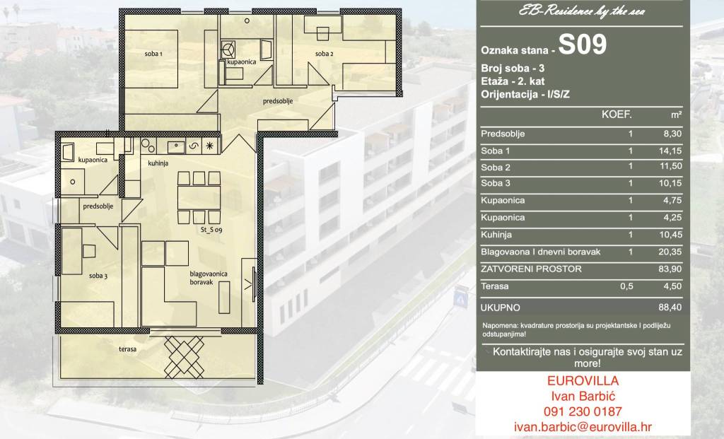 Trogir, novogradnja trosoban stan od 92,9 m2 drugom katu s pogledom na more, s garažnim parkirnim mjestom povezan liftom.Trosoban komforan stan u novogradnji na drugom katu ukupne korisne površine 92,9 m2, koji se sastoji se od: dnevnog boravka, kuhinje s blagovaonicom otvorenog tipa, tri spavaće sobe, dvije kupaonice, hodnika i predsoblja, te natkrivenog balkon na zapadu.Ukupna površina stana iznosi 92,9 m2, od čega je zatvorena stambena korisna površina stana 83,9 m2 uz balkon od 9 m2 na zapadu. Ukupna neto korisna površina 88.40 m2.Uz kupnju stana je obvezna kupnja jednog garažnog parkirnog mjesta u podzemnoj garaži po cijeni 20.000 EUR, uz lift iz garaže do stana.Orijentacija stana je istok- zapad uz dosta svjetla i obolje sunca što će dodatno učiniti dati na komforu i življenja u nekretnini.Za više informacija stojim Vam na raspolaganju na navedenim kontaktima... Više na eurovilla.hr, ID: 999594
