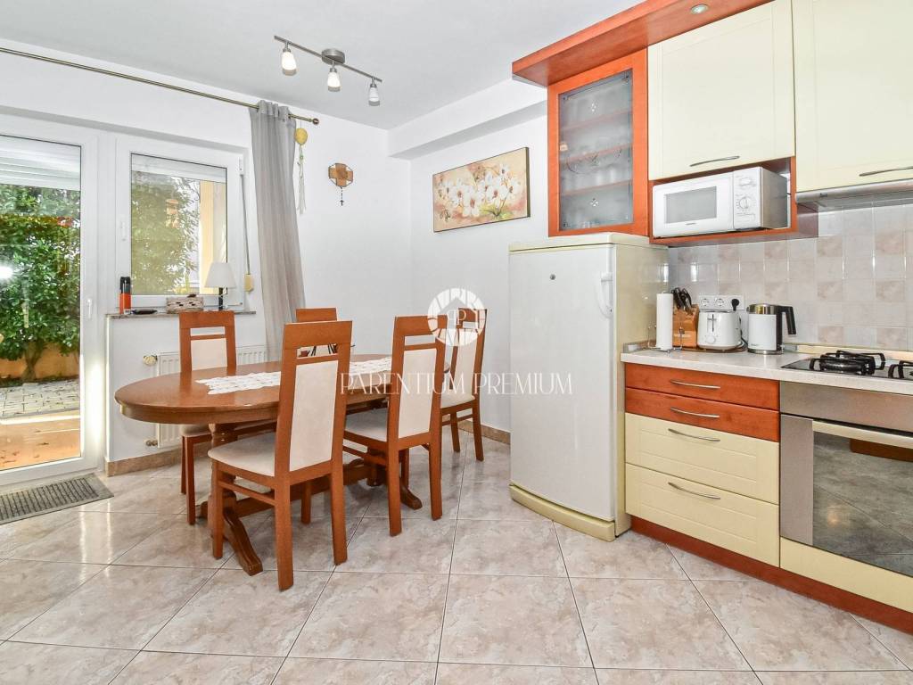 The ground floor features an entrance area with a wardrobe, guest toilet, utility/laundry room, storage room and a spacious living room connected to the kitchen and dining area. From the living room, there is access to a covered terrace and a beautifully arranged yard offering complete privacy an ideal space for relaxing and socializing during the warmer months.