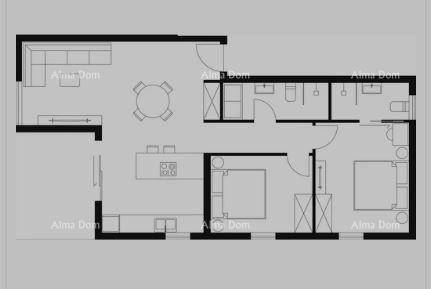 L'appartamento si trova all'ultimo piano dell'edificio 1 e consiste in: ingresso, due camere da letto, due bagni, un ampio soggiorno con cucina e sala da pranzo e un balcone coperto.