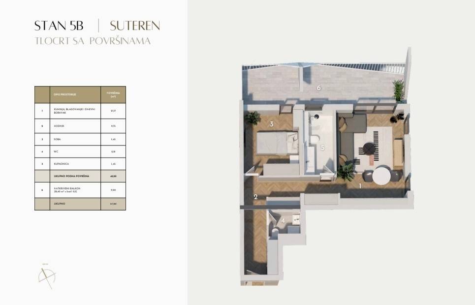Split | Luksuzna stambena zgrada suvremenog dizajnaProjekt u Splitu predstavlja ekskluzivnu novogradnju smještenu na jednoj od najatraktivnijih mikrolokacija . Riječ je o dvije luksuzne stambene zgrade s ukupno 56 stambenih jedinica, projektiranoj i građenoj prema najvišim standardima kvalitete, s posebnim naglaskom na moderan, funkcionalan i suvremen način života. Planirano useljenje predviđeno je u drugoj polovici 2027. godine.Z1 S5B- Jednosoban stan smješten na etaži prizemlja, zatvorene površine 48 m², kojem dodatnu vrijednost daje natkriveni balkon ukupne površine 18,40 m². Funkcionalan raspored prostora obuhvaća hodnik, jednu spavaću sobu, jedna kupaonicu, jedan WC te dnevni boravak s blagovaonicom i kuhinjom otvorenog tlocrta s izlazom na balkon.Ukupna obračunska površina stana iznosi 57,20 m².Obavezna kupnja jednog garažnog ili vanjskog parkirnog mjesta.Stan će biti opremljen vrhunskom opremom koja uključuje podno grijanje cijelog stana, klimatizaciju u svim prostorijama, ALU stolariju, protuprovalna ulazna vrata, parket prve klase te visokokvalitetnu keramiku i sanitarnu opremu.Nekretnina se nalazi svega 230 metara od mora, u blizini svih potrebnih sadržaja ( trgovina, restorana, privatne međunaradone škole, nove šetnice I plaža ), što ovu lokaciju čini idealnim izborom za ugodan i kvalitetan život ili investiciju.Za sve dodatne informacije stojimo na raspolaganju.... Više na eurovilla.hr, ID: 374397