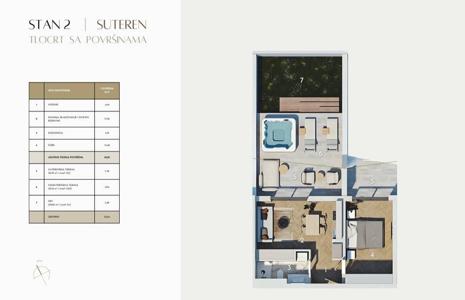 Split | Luksuzna stambena zgrada suvremenog dizajnaProjekt u Splitu predstavlja ekskluzivnu novogradnju smještenu na jednoj od najatraktivnijih mikrolokacija . Riječ je o dvije luksuzne stambene zgrade s ukupno 56 stambenih jedinica, projektiranoj i građenoj prema najvišim standardima kvalitete, s posebnim naglaskom na moderan, funkcionalan i suvremen način života. Planirano useljenje predviđeno je u drugoj polovici 2027. godine.Z1 S2- jednosoban stan smješten na etaži prizemlja, zatvorene površine 39,85 m², kojem dodatnu vrijednost daje polunatkrivena terasa ukupne površine, te vrt površine 22,85 m2. Funkcionalan raspored prostora obuhvaća hodnik, jednu spavaću sobu, kupaonicu, WC, te dnevni boravak s blagovaonicom i kuhinjom otvorenog tlocrta s izlazom na terasu i vrt .Ukupna obračunska površina stana iznosi 53,64 m².Obavezna kupnja jednog garažnog ili vanjskog parkirnog mjesta.Stan će biti opremljen vrhunskom opremom koja uključuje podno grijanje cijelog stana, klimatizaciju u svim prostorijama, ALU stolariju, protuprovalna ulazna vrata, parket prve klase te visokokvalitetnu keramiku i sanitarnu opremu.Nekretnina se nalazi svega 230 metara od mora, u blizini svih potrebnih sadržaja ( trgovina, restorana, privatne međunaradone škole, nove šetnice I plaža ), što ovu lokaciju čini idealnim izborom za ugodan i kvalitetan život ili investiciju.Za sve dodatne informacije stojimo na raspolaganju.... Više na eurovilla.hr, ID: 914893