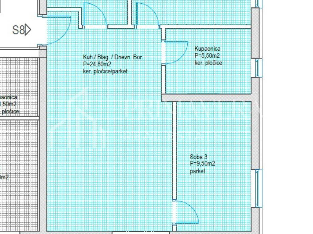 Stan S8, na 2. katu zgrade, sastoji se od kuhinje s blagovaonicom i dnevnim boravkom, kupaonice, tri spavaće sobe te natkrivene terase. Stanu pripadaju dva parkirna mjesta. Ukupna korisna površina stana s pripadcima iznosi 67,75 m2.