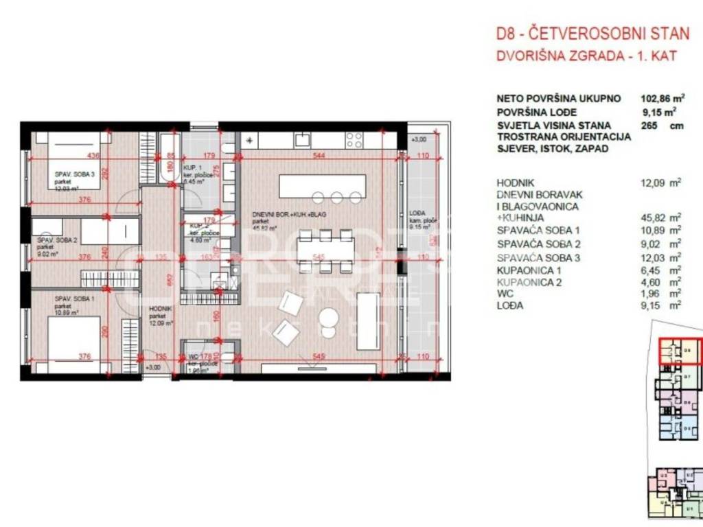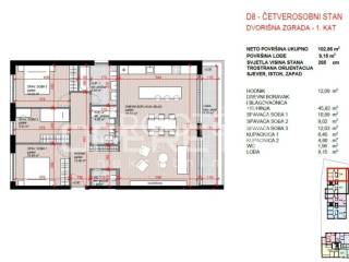 Stan D8 je smješten na prvom katu ukupne površinu 110m. Sastoji se od ulaznog hodnika, open space boravka s kuhinjom i blagovaonicom s izlazom na lođu, tri spavaće sobe, wc i dvije kupaonice.