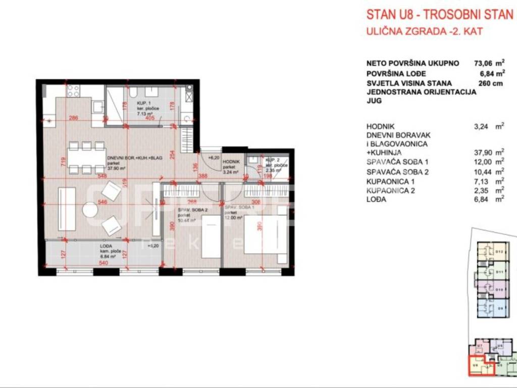 Stan U8 je smješten na drugom katu ukupne površinu 77m. Sastoji se od ulaznog hodnika, open space boravka s kuhinjom i blagovaonicom, dvije spavaće sobe, dvije kupaonice, lođe.