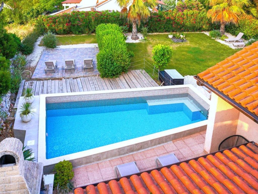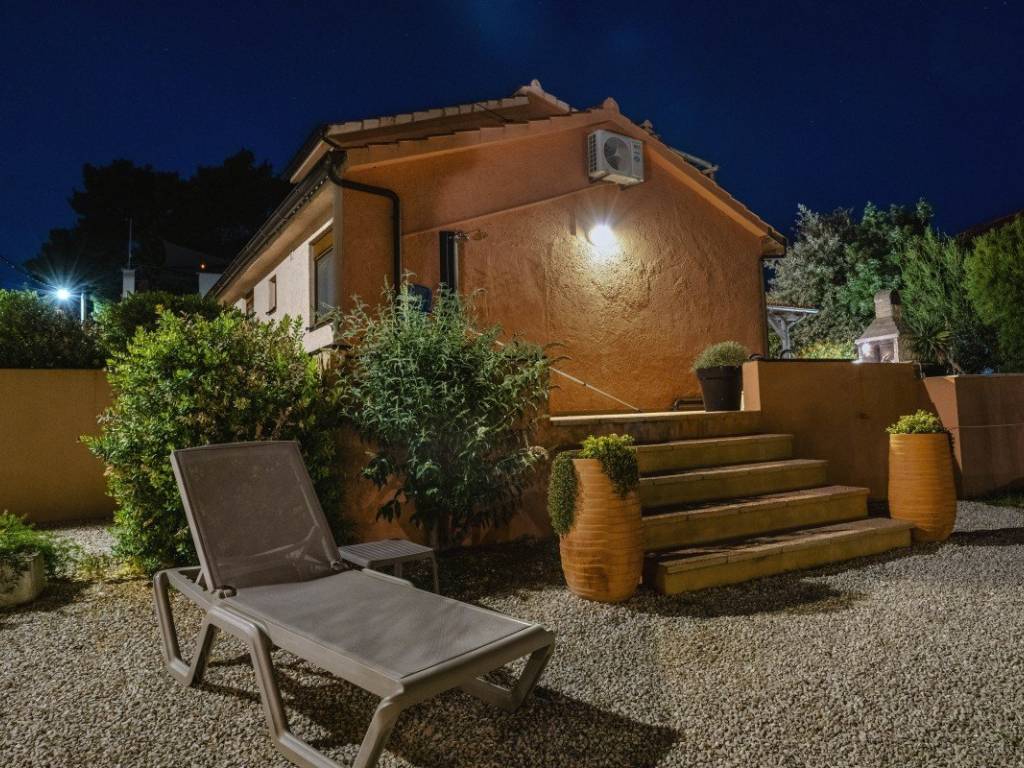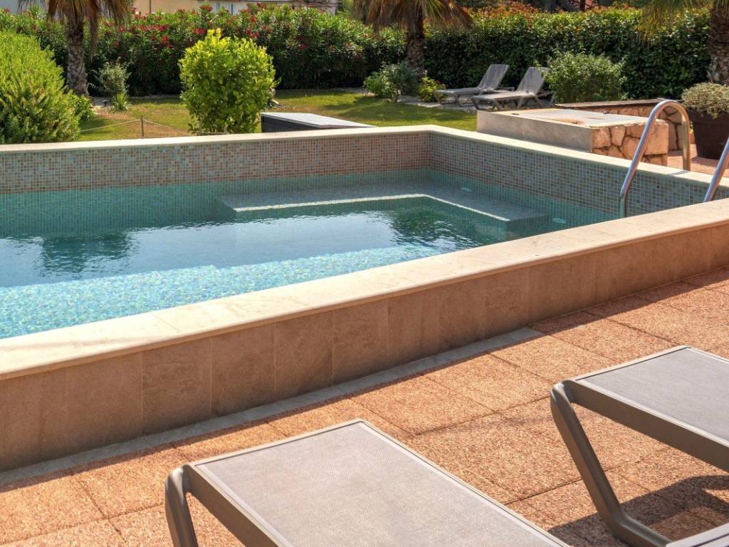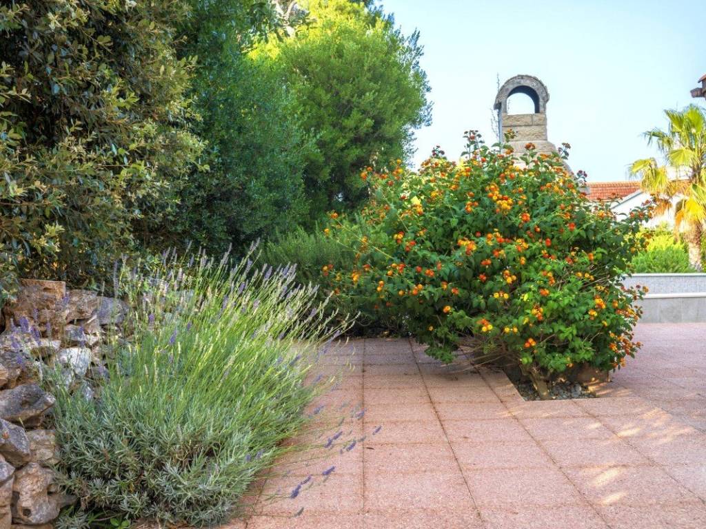 Il giardino è abbellito da piante ornamentali con un prato ben curato, palme e diverse specie di piante mediterranee, con impianto di irrigazione automatico. Nel cortile si trova una piscina di 30 m completamente ristrutturata due anni fa. La proprietà offre un comodo accesso carrabile e due posti auto.