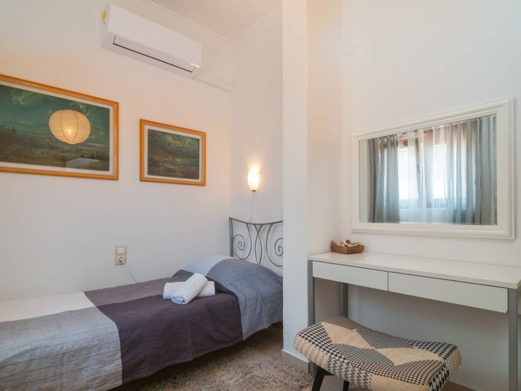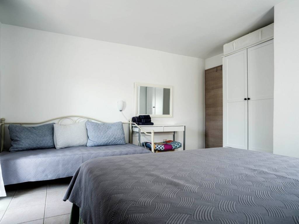 La disposizione degli spazi è funzionale e si sviluppa su più piani. Al primo piano si trovano due camere da letto, due bagni, un balcone e una zona giorno che comprende soggiorno, cucina e sala da pranzo con accesso alla terrazza giardino (con camino esterno) e al cortile. Al piano superiore si trovano due ampie camere da letto con balcone e un ulteriore bagno. Allultimo piano si trova una sauna con doccia e accesso alla terrazza/solarium. La casa è completamente climatizzata e abitabile tutto lanno.