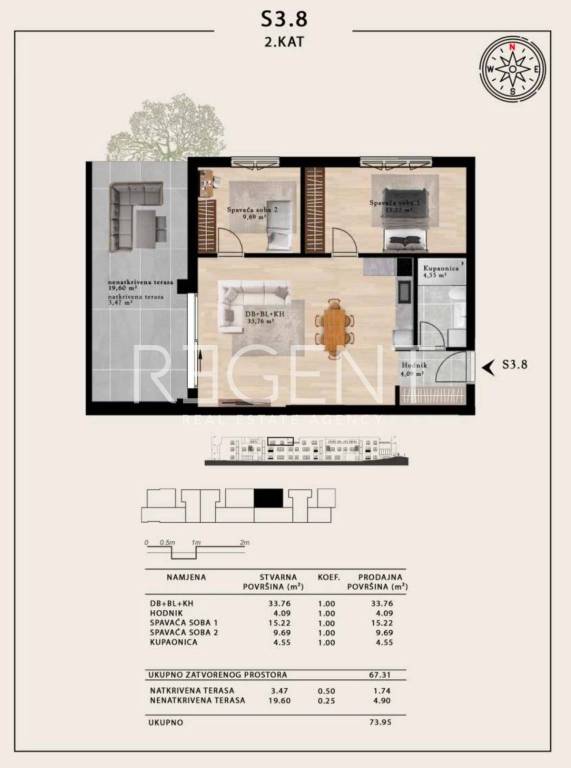 Questa unità residenziale si trova al 2° piano di un moderno edificio di nuova costruzione nella parte occidentale di Zagabria, a soli 1,7 km dall'Arena Centar. Il progetto comprende tre piani, garantendo così privacy, tranquillità e uno spazio abitativo funzionale. L'appartamento, con una superficie totale di 73,95 m2, è composto da: • Corridoio (4,09 m2) • Bagno (4,55 m2) • 2 camere da letto (15,22 m2 e 9,69 m2) • Soggiorno con cucina e sala da pranzo (33,76 m2) • Terrazza coperta (3,47 m2) • Terrazza scoperta (19,60 m2) Attrezzature e qualità: • Riscaldamento e raffreddamento: riscaldamento a pavimento e pompa di calore • Serramenti esterni: serramenti in PVC a tre strati • Serramenti interni: porta d'ingresso antintrusione e antincendio • Pavimenti: laminato + piastrelle in ceramica • Pareti: colore bianco e piastrelle in ceramica • Facciata: facciata decorativa • Tetto: tetto piano non percorribile con isolamento termico + membrana in PVC • Struttura: pareti interne ed esterne in cemento armato spesse 20 cm, pareti divisorie non portanti (all'interno degli appartamenti) in muratura di mattoni spessi 10 cm, altezza dei piani: 1° piano 3,63 m, 2° piano 2,83 m, 3° piano 2,91 m • Classe energetica: A Questo moderno complesso residenziale si trova nel quartiere di Sveta Klara a Zagabria, vicino a Remetinec, uno dei quartieri in rapido sviluppo e caratterizzato da un'eccellente connessione di trasporto con il resto della città. La posizione è a soli 1,7 chilometri dall'Arena Centar, il che la rende una scelta ideale per coloro che desiderano vivere vicino a tutti i servizi importanti, mentre nelle immediate vicinanze sono disponibili anche linee di autobus, scuole e negozi, facilitando gli impegni quotidiani. La distanza dal centro di Zagabria è di soli 6,8 chilometri e la vicinanza all'autostrada consente un rapido accesso ad altre parti della città e ai dintorni. Questo progetto rappresenta un'eccellente opportunità per una vita tranquilla con un'eccellente infrastruttura, perfetta per famiglie, giovani lavoratori e investitori. L'acquisto di un appartamento è accompagnato dall'obbligo di acquistare un posto auto esterno. Fine lavori prevista: fine del 1° trimestre del 2026. Per ulteriori informazioni o per fissare un appuntamento per una visita, non esitate a contattarci!
