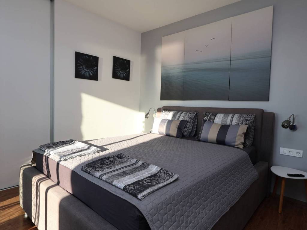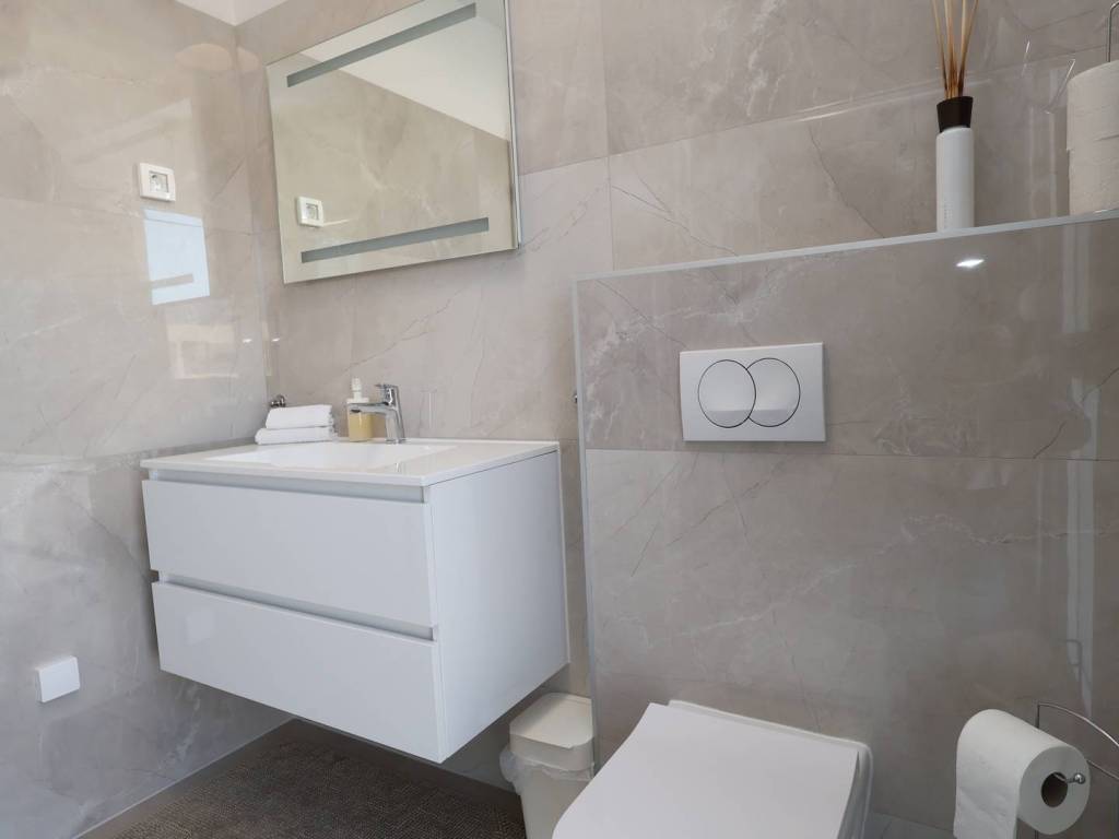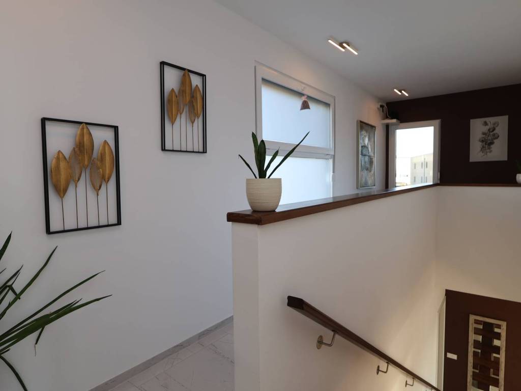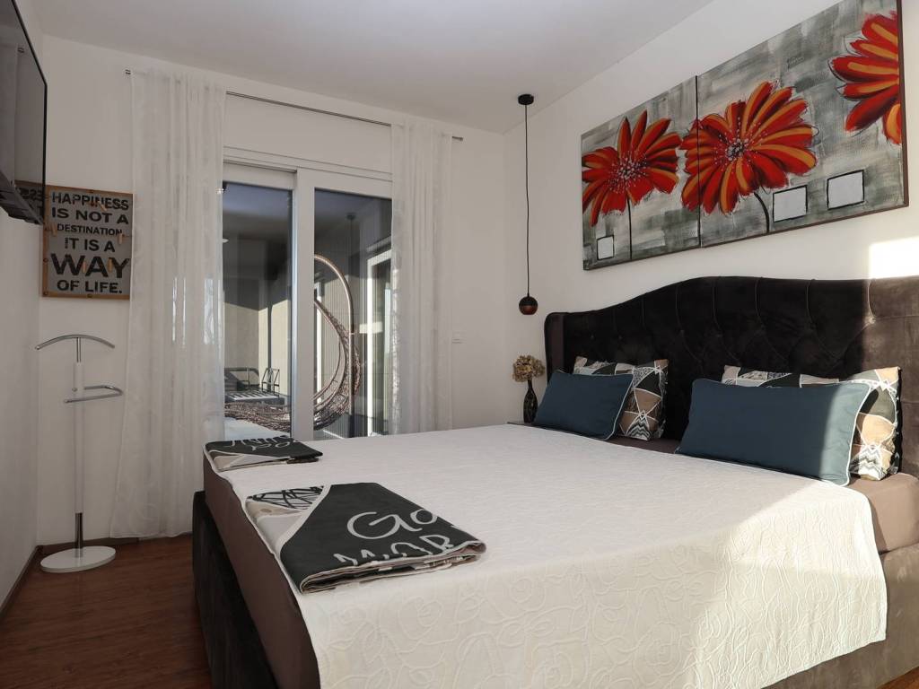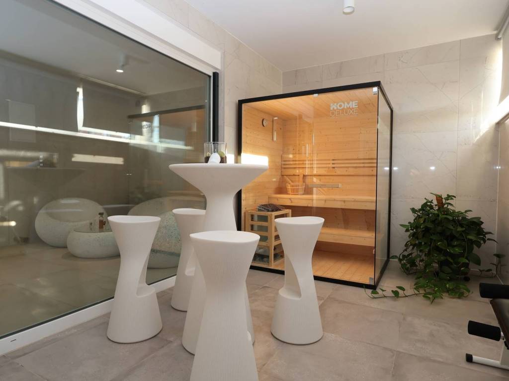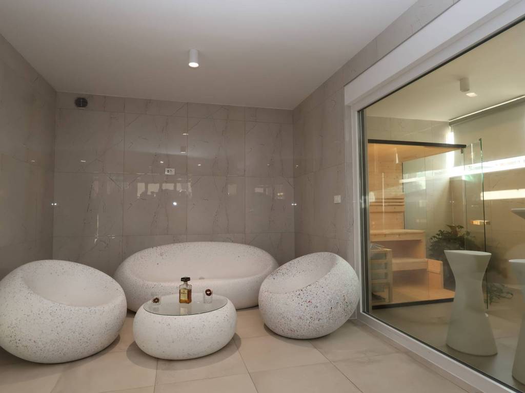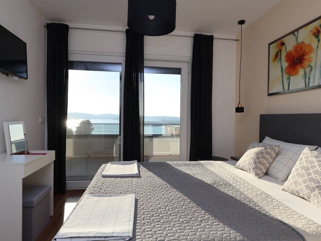 Unutranjim modernim drvenim stepenicama dolazimo na prvu etažu, gdje se nalaze tri spavaće sobe sa ugradbenim ormarima, od kojih svaka ima izlaz na zajedničku terasu sa prekrasnim pogledom na more te svakoj sobi pripada vlastita kupaonica. Dodatni luksuz ovoj nekretnini, daje i Spa zona koja se nalazi u podrumu zgrade, povezana unutarnjim stepenicama sa gornjim etažama, a sadrži bazen i saunu, prostor za odmor, pa time ovo mjesto čini savršeno za opuštanje i mir.