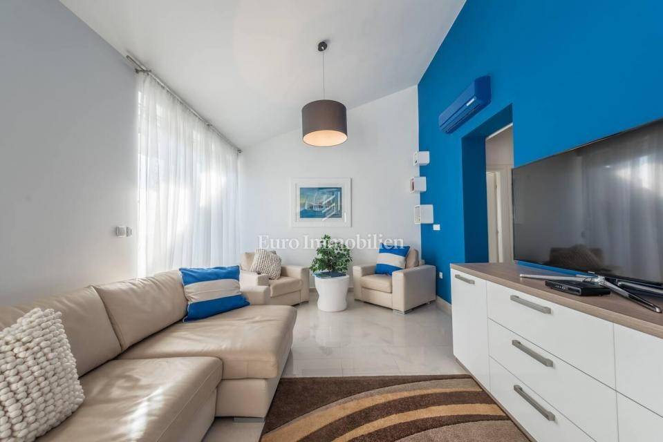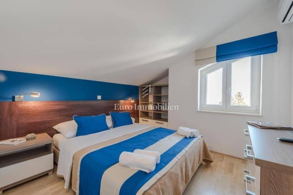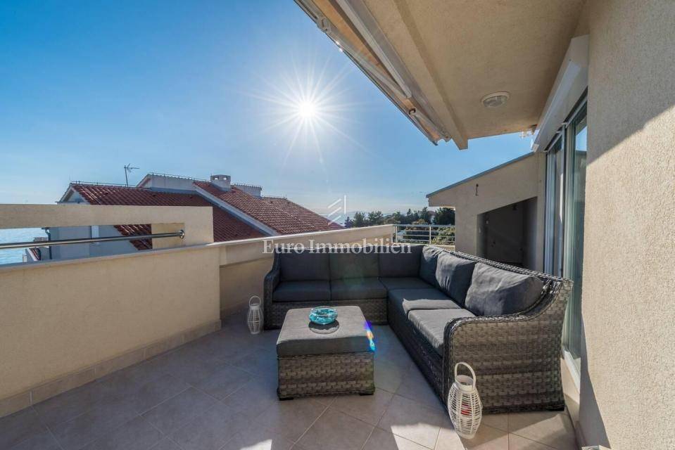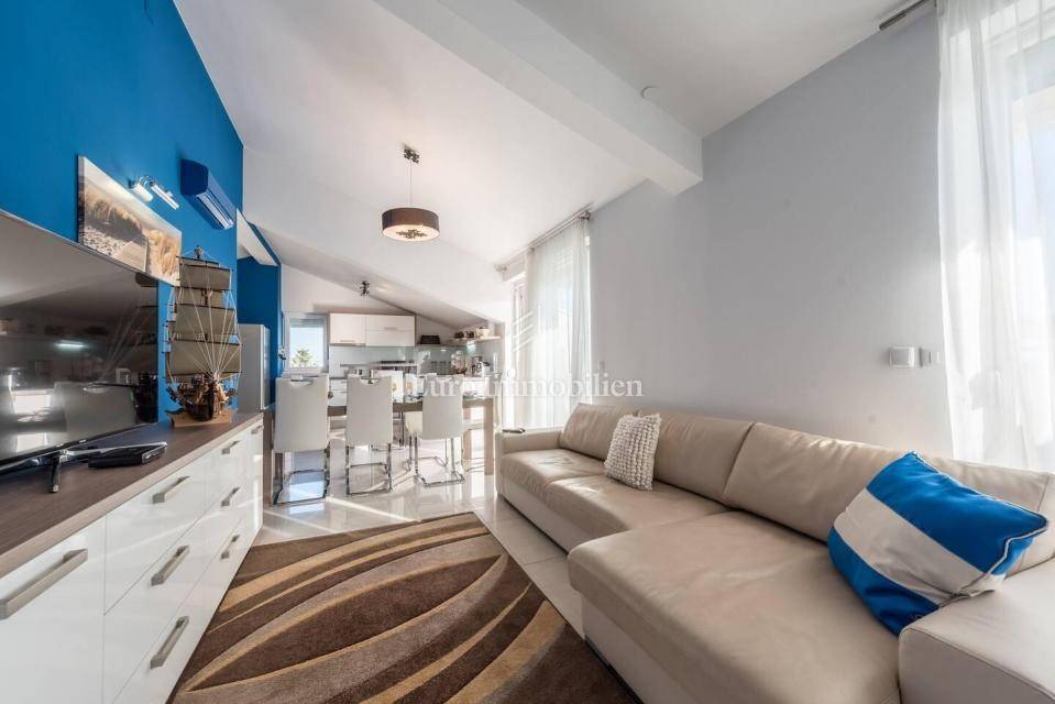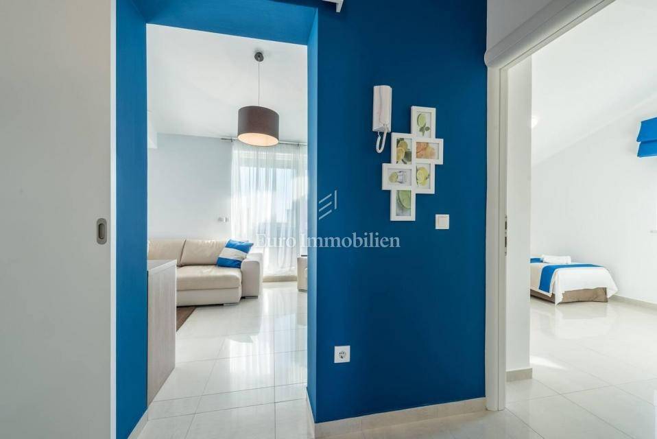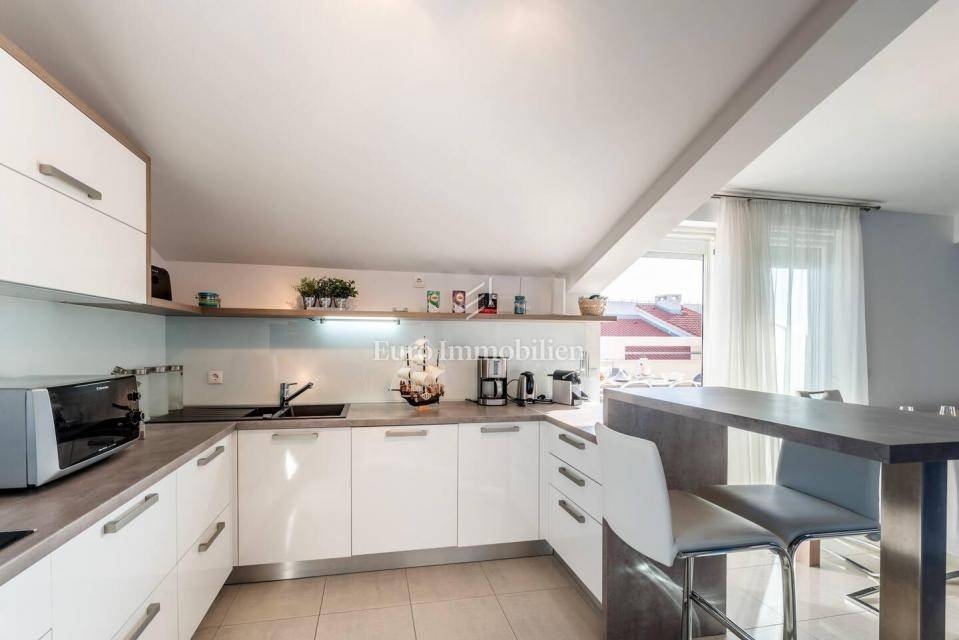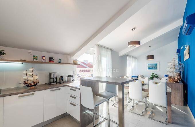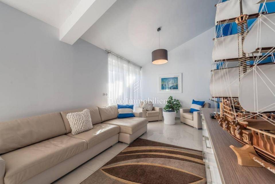 In sostanza, si tratta di due appartamenti collegati in un unico grande attico, con tre camere da letto, due bagni e un ampio open space con soggiorno e cucina. Ampie pareti scorrevoli conducono a una terrazza panoramica con tre parti, una zona solarium, una zona conviviale e una zona lounge. L'appartamento è dotato di due ripostigli al piano interrato e due posti auto nel cortile del condominio. Tutti gli ambienti sono climatizzati e l'appartamento è completamente arredato e corredato e viene venduto come tale.