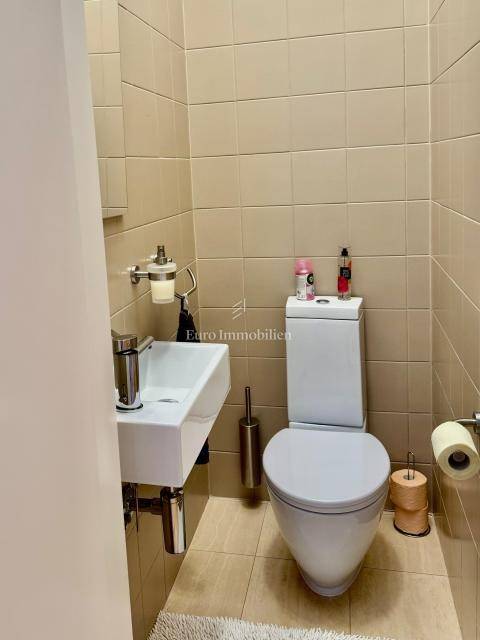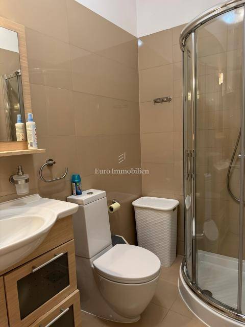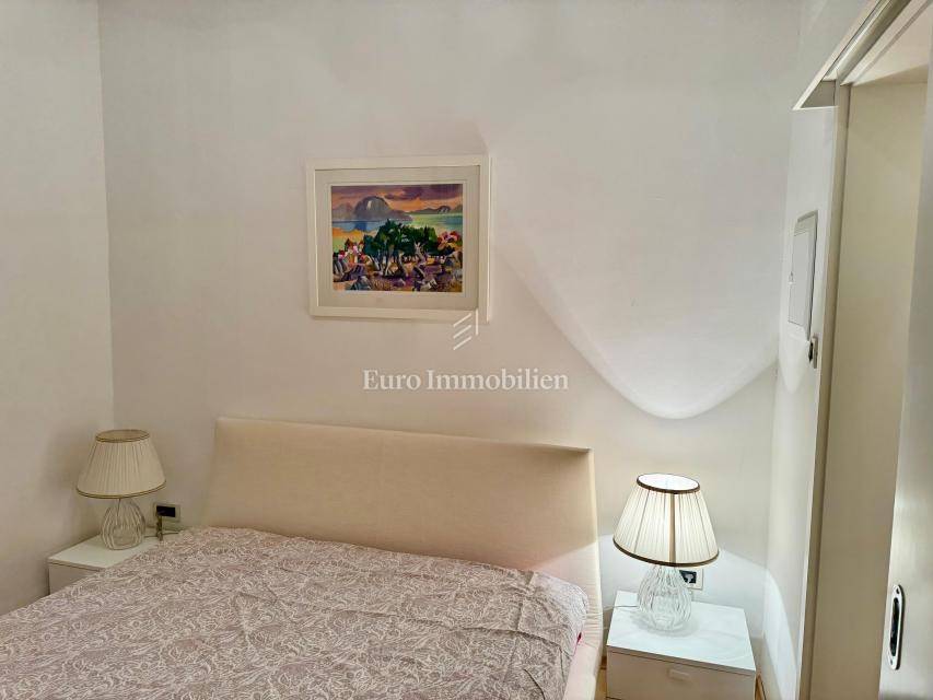 L’appartamento è composto da due camere da letto, ognuna con il proprio bagno, un WC per gli ospiti, cucina con zona pranzo e soggiorno. Dal soggiorno si accede a una terrazza coperta di 40 m² con vista mare – un dettaglio raro per una posizione così centrale. Fa parte della proprietà anche un ripostiglio di 4 m² situato al piano terra dell’edificio.