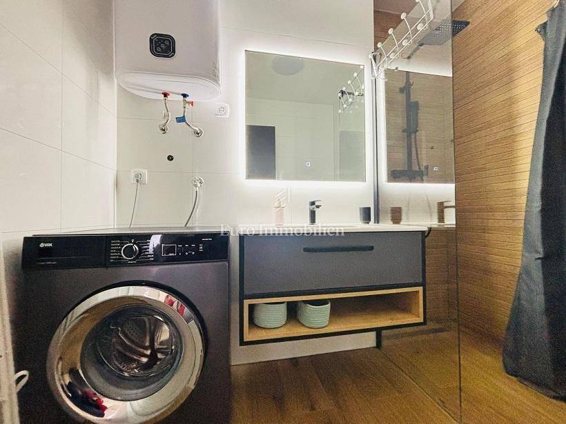 L'appartamento è composto da ingresso, soggiorno con cucina a vista e sala da pranzo, dispensa, bagno di servizio, bagno principale con WC, due camere da letto e terrazza coperta. È dotato di pavimenti in parquet, tapparelle elettriche e tre condizionatori installati nel soggiorno e nelle camere da letto. L'immobile dispone di una certificazione energetica di classe A+.