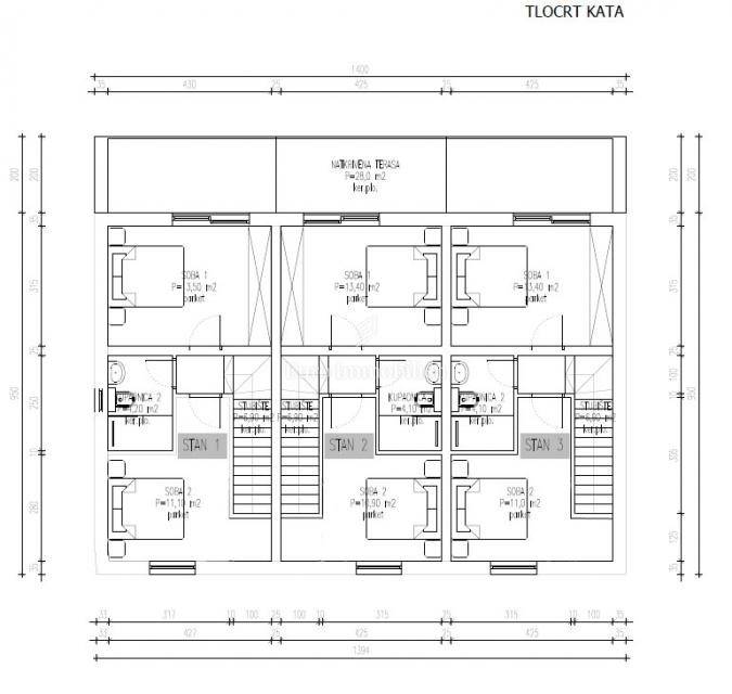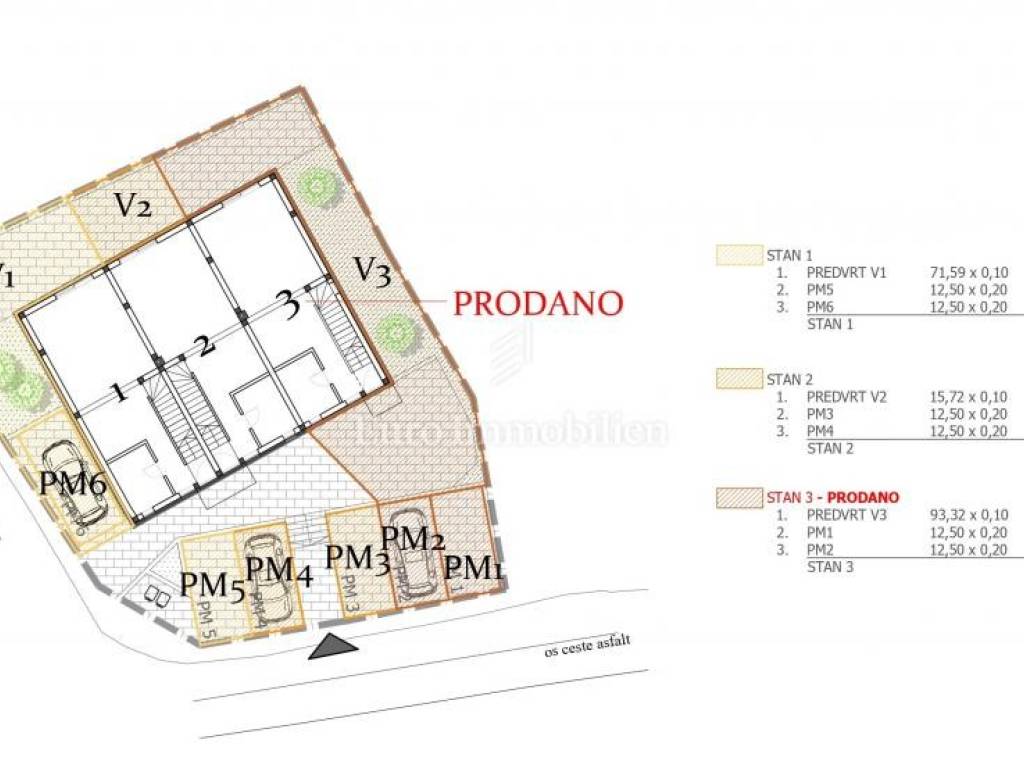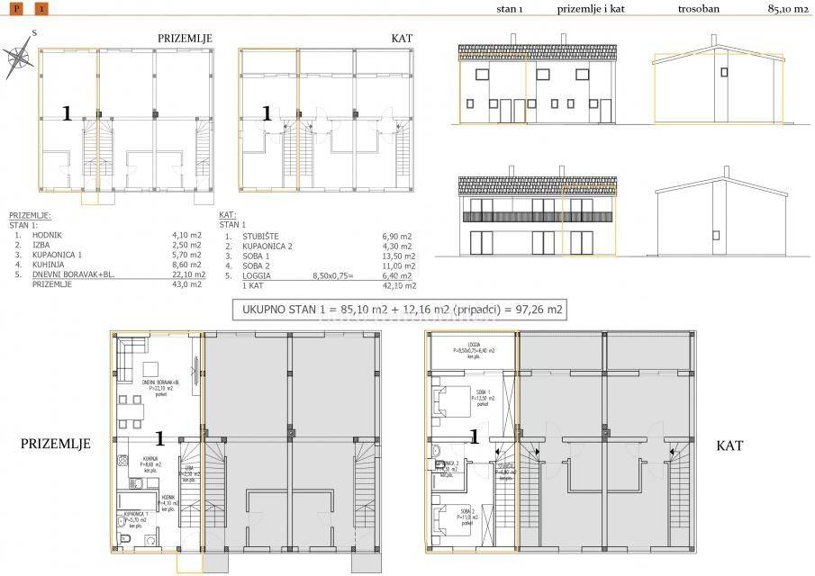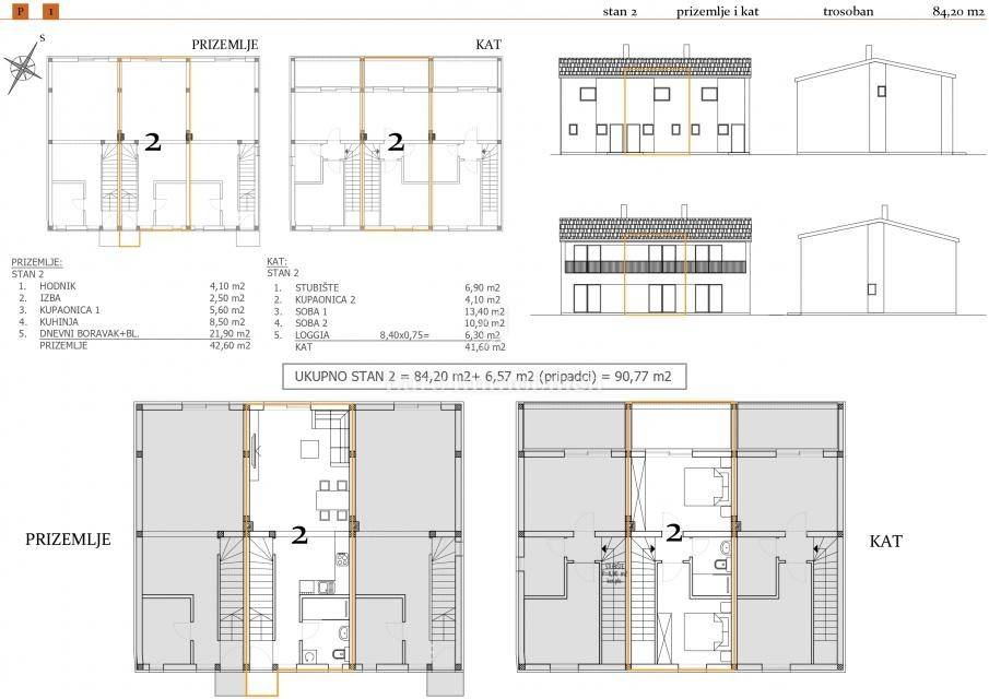 PROPERTY DESCRIPTION: GROUND FLOOR - entrance hall, bathroom, spacious living room with kitchen and dining room, exit to a spacious terrace (decoration + preparation for sitting on the terrace), room 1ST FLOOR - two bedrooms (one with access to the terrace), bathroom, loggia Each apartment has two parking spaces that are included in the price.