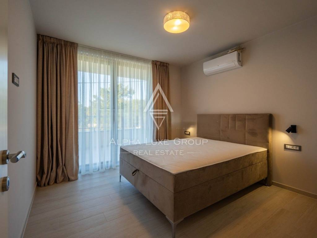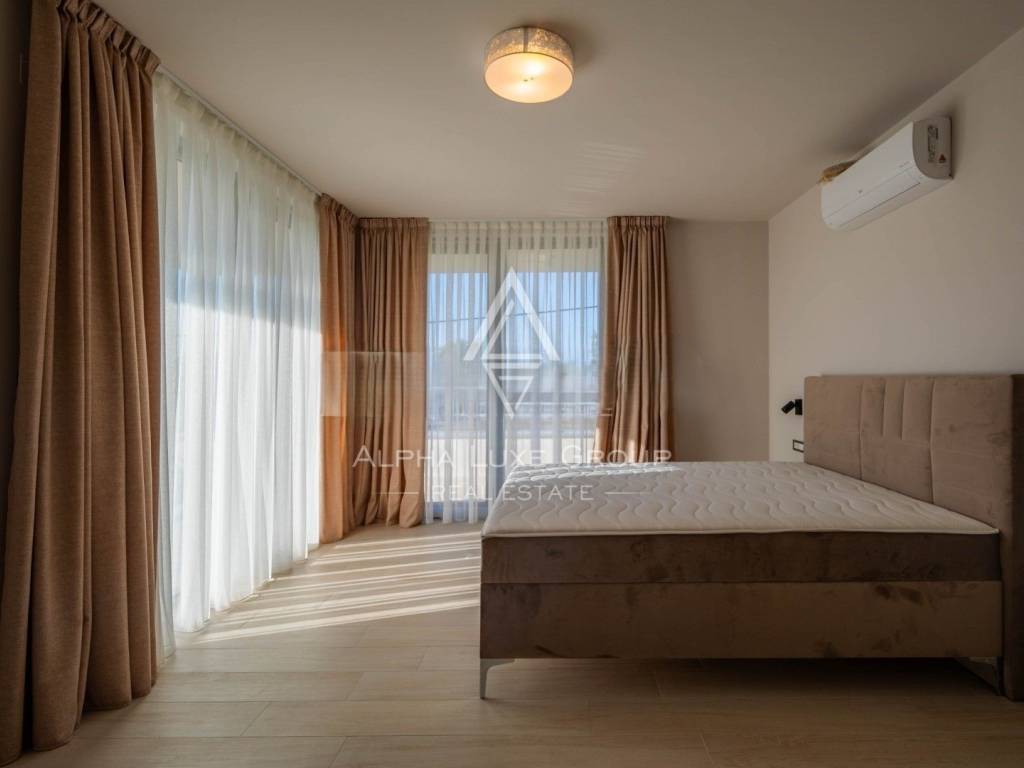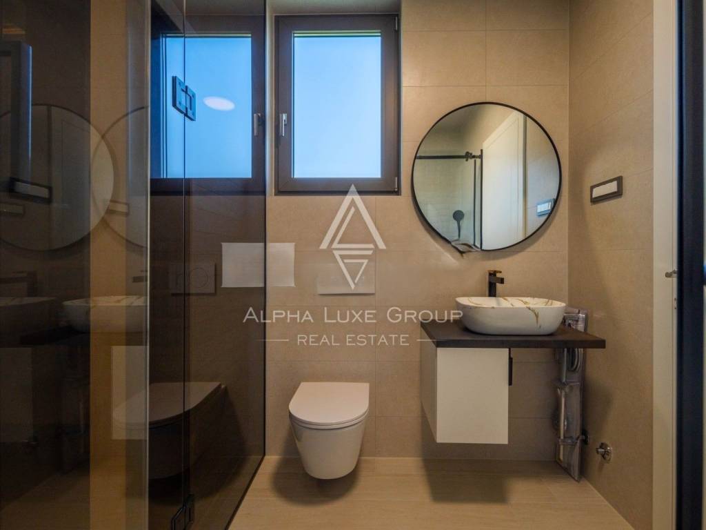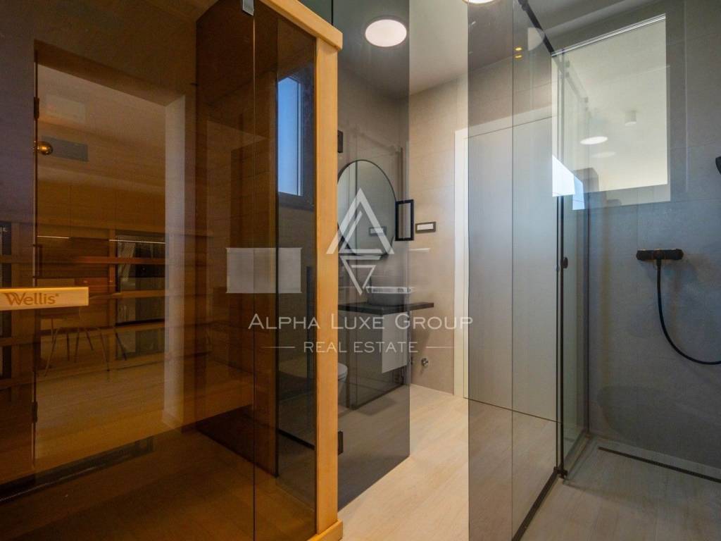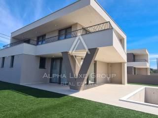 For sale is a beautiful detached house B1 - an urban villa located on the island of Krk , in Brzac , with a living area of 213 m2 . The villa consists of ground floor and first floor and an associated garden . On the ground floor there is an entrance hall , a kitchen with a dining room and a living room , a bedroom with its own bathroom , a toilet , a storage room , a sauna , two storage rooms and a covered terrace . Upstairs there are three bedrooms with access to the terrace , two bathrooms , a dressing room , a covered and an uncovered terrace . The villa has a beautiful view of the sea and is completely finished . The interior is fully furnished and as such is for sale . The environment is landscaped with greenery and an irrigation system and a remote fence .