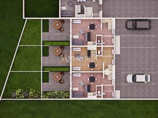 The apartment has electric underfloor heating throughout and 3 air conditioning units. It is built with thermal brick blocks, and the façade has 10 cm Styrofoam insulation. Windows are PVC with shutters, mosquito nets, and triple glazing. Floors are covered with tiles.