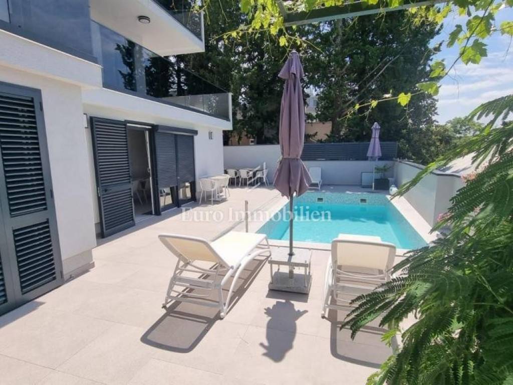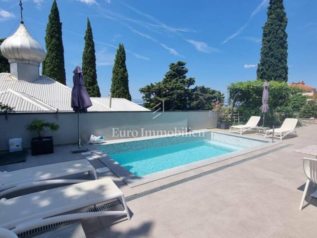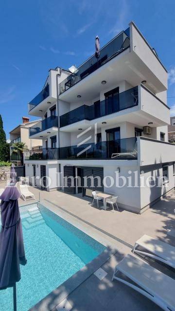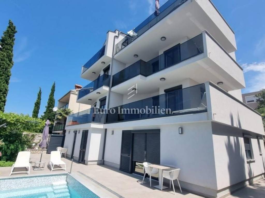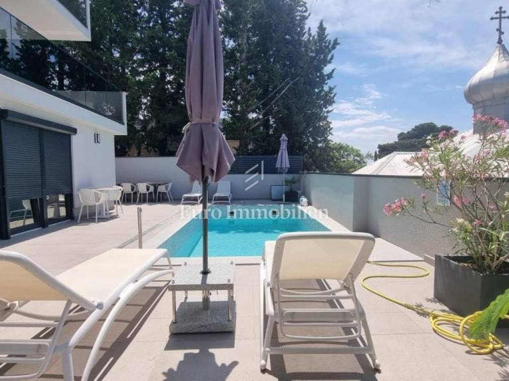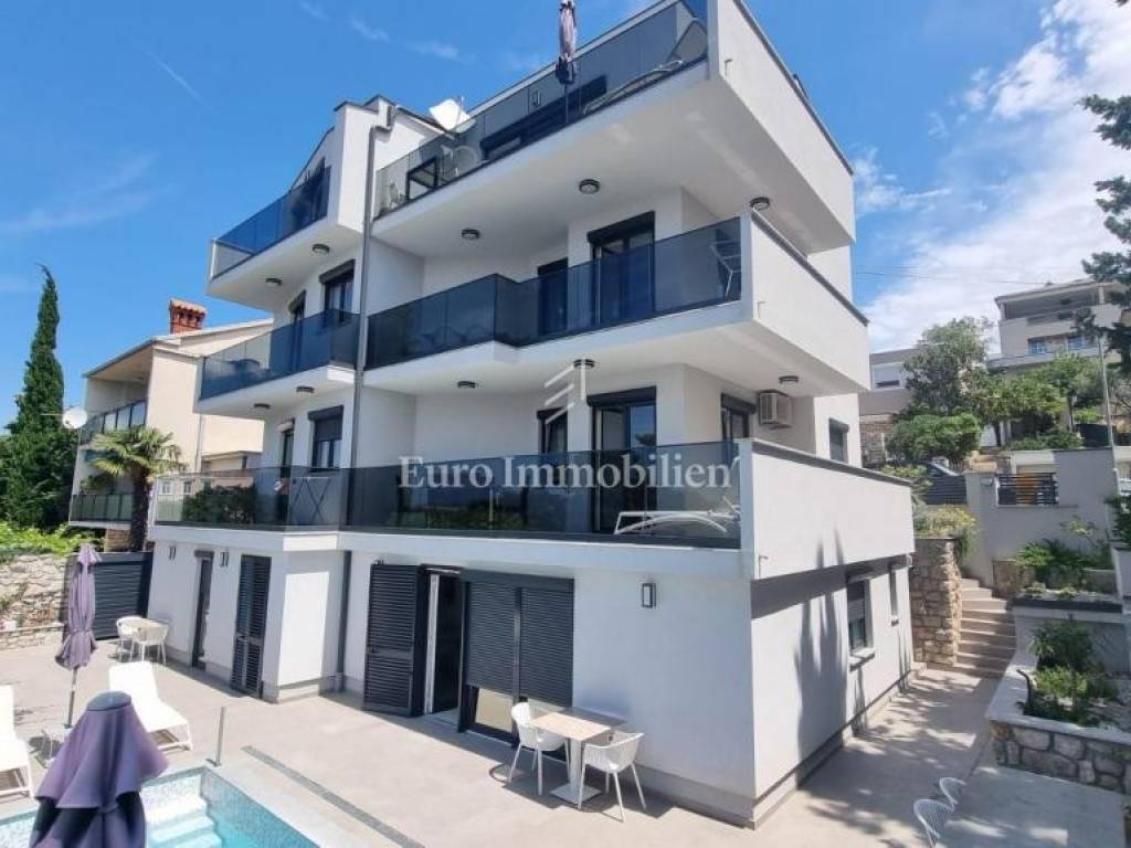 In a prime location in Crikvenica, a house with 8 apartments, 5 of which are in tourist rental, is for sale. The house is completely renovated and furnished. In the yard, at the front of the house, is a pool with a sunbathing area, two one-bedroom apartments and one smaller studio apartment. On the 1st and on the 2nd floor are two one bedroom apartments with a living room, while a beautiful penthouse occupies the last floor of this house.