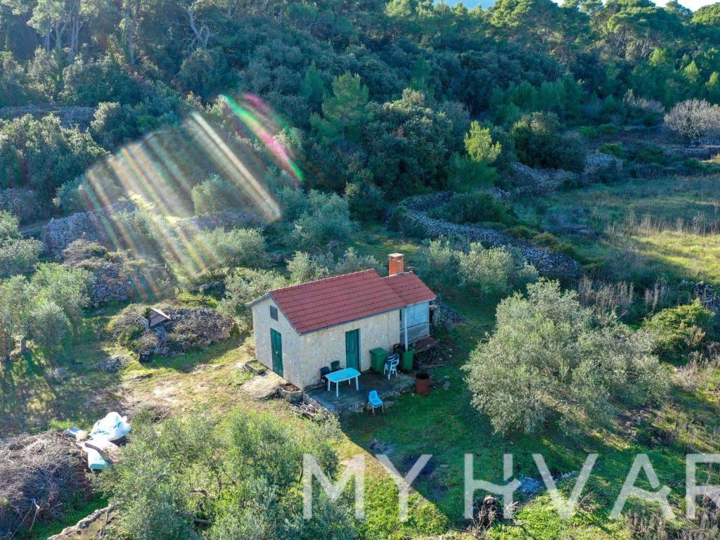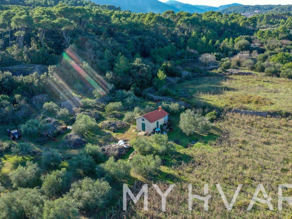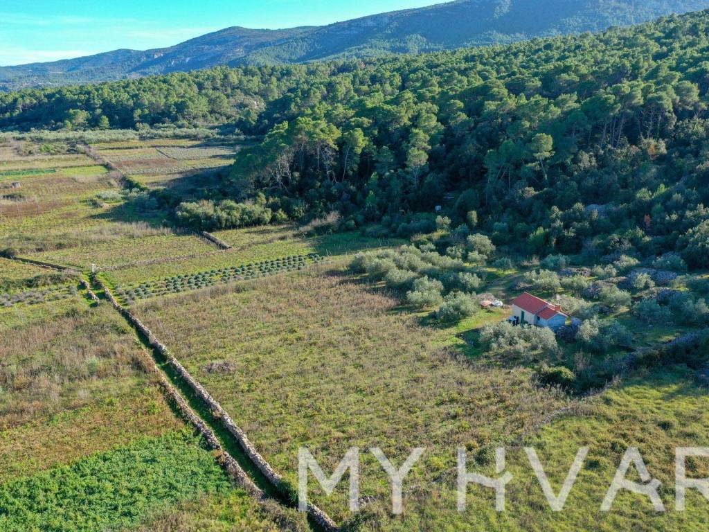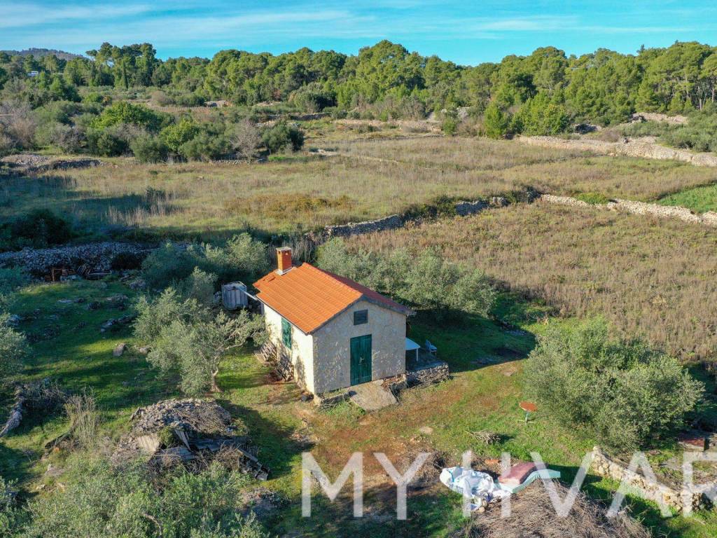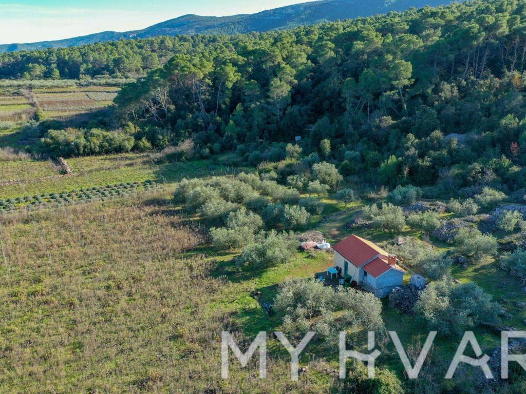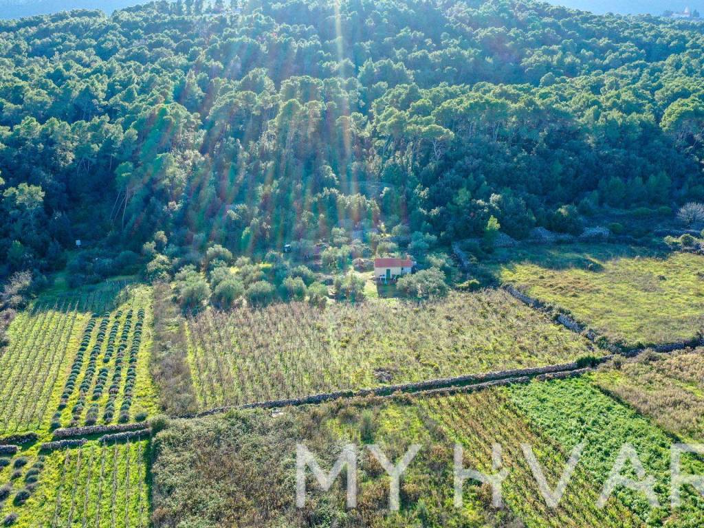 Nella parte più fertile dell'isola di Hvar, nel campo di Polonda tra Jelsa e Svirač, questa affascinante casa si trova circondata da risorse naturali, su un ampio terreno di 8.726 m. La casa dispone di più di 20 mq, con relativo serbatoio dell'acqua. Sul terreno ci sono circa 50 ulivi di tre varietà: lastovka, italiano e oblica. I vigneti contano 700 viti vecchie delle varietà Maraština e Kuča, mentre le viti giovani, per un totale di 750 viti, comprendono 250 Plavac, 250 Bogdanuša e 250 varietà toscane. Questa proprietà è un vero giardino botanico mediterraneo, ideale per gli amanti della natura e dell'agricoltura.