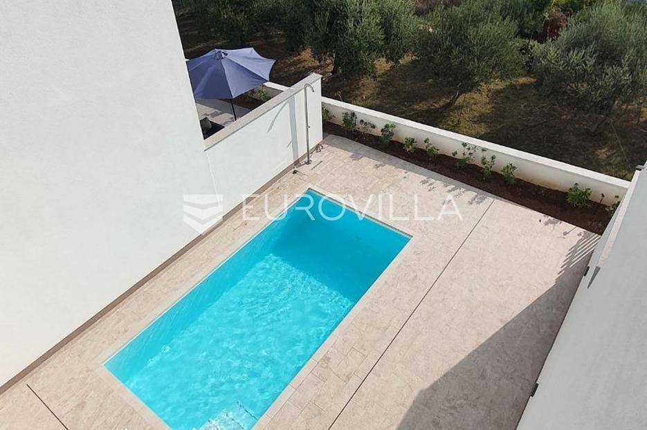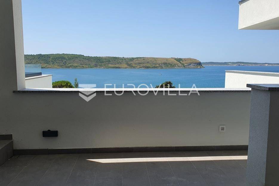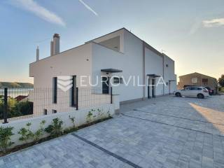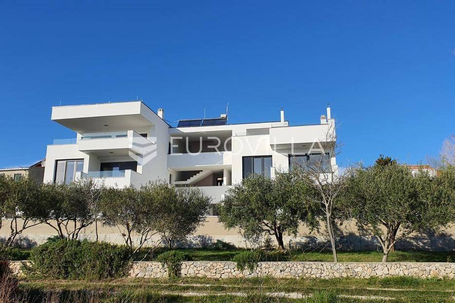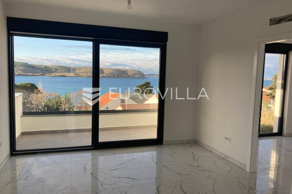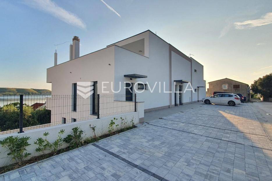 RTINA MIOČIĆI - Novogradnja 100 m od mora, otvoren pogled na more, bazenU Rtini Miočićima, na mirnoj lokaciji svega 100 m od plaže, prodaje se novogradnja građena i projektirana u armirano-betonskoj konstrukciji prema visokim protupotresnim i ostalim standardima.Objekt se sastoji od 5 stambenih jedinica raspoređenih u 2 objekta povezana zajedničkim hodnikom i stubištem. Zgrada je izgrađena na 3 etaže: suteren, prizemlje i kat. U suterenu se nalazi zajednički bazen, veliko sunčalište i terasa. Objekt je smješten na kaskadnom terenu, što svim etažama omogućuje otvoren pogled prema Ljubačkom zaljevu.Prodaje se Stan D, trosoban stan u prizemlju, ukupne korisne površine 73,96 m2. Stan se sastoji od dva zasebna ulaza, hodnika, dnevnog boravka, blagovaonice i kuhinje otvorenog tlocrta, dvije spavaće sobe, dvije kupaonice, natkrivene terase površine 5,95 m2 i lođe 5,85 m2. Stanu pripada vanjsko parkirno mjesto P3 površine 14,85 m2.Stan je opremljen Mitsubishi multi split klima uređajima s 3 unutarnje jedinice, podnim grijanjem putem toplinske pumpe te dimnjakom za mogućnost ugradnje kamina. Ugrađena je aluminijska antracit stolarija s električnim roletama i komarnicima, a u interijeru su postavljene keramičke pločice 1. klase, visoki sjaj mramor.Zahvaljujući dvama odvojenim ulazima, stan se može koristiti i kao dvije zasebne cjeline, odnosno kao studio apartman s natkrivenim balkonom i dvosoban stan s natkrivenom terasom. Oba dijela imaju pogled na more.Cijeli objekt za zajedničko grijanje vode koristi dizalicu topline i/ili solarne kolektore sa spremnikom od 1200 litara. Kao zajednički dio suvlasnicima pripada korištenje bazena, sunčališta, okoliša i parkirališta.Dodatno se prodaje i:Katna terasa korisne površine 70,24 m2, dijelom natkrivena, s posebnim zatvorenim ulazom i svim komunalnim priključcima. Ima velik potencijal za izvedbu penthouse apartmana s velikom terasom i stanom. Cijena: 125.000,00€Parkirno mjesto P1 - 10,25 m2. Cijena: 8.100,00€Parkirno mjesto P2 - 12,30 m2. Cijena: 9.500,00€Parkirno mjesto P6 - 13,50 m2. Cijena: 10.500,00€Parkirno mjesto P8 - 14,38 m2. Cijena: 11.300,00€U cijenu je uključen PDV!Rtina je udaljena oko 15 km od izlaza Posedarje, oko 13 km od autoceste A1, a od Zagreba svega oko 2 sata vožnje. U blizini se nalaze 5 nacionalnih parkova, 3 parka prirode te Zadar, Šibenik, Skradin i otok Pag.... Više na eurovilla.hr, ID: 851166