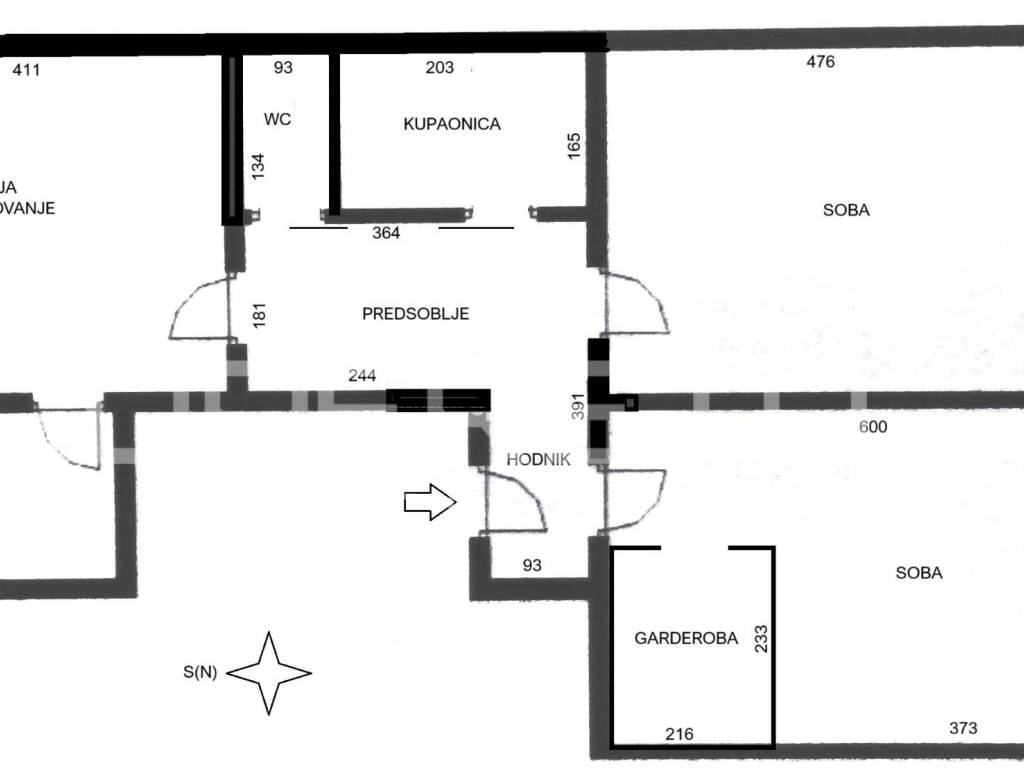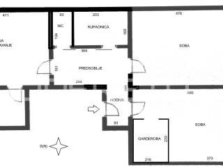 Sastoji se od: ulaznog hodnika, dvije velike sobe, predsoblja, kuhinje s blagovanjem, manje sobe, kupaonice, zasebnog wc-a i lođe.